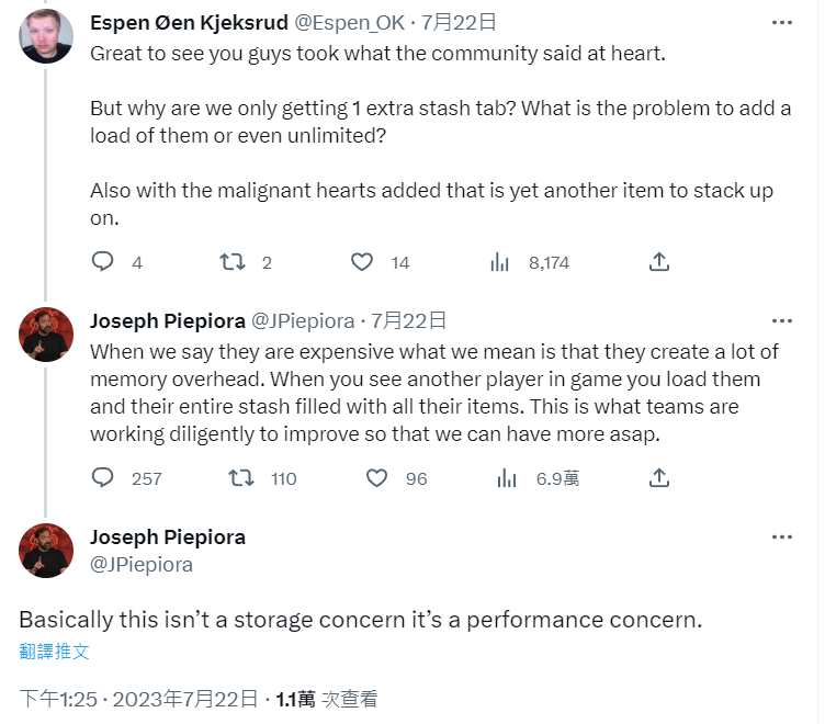 在最近一篇推特中,助理遊戲總監 Joseph Piepiora 回應了為何只新增一頁倉庫頁面,而無法立即對倉儲空間做有效改善。Joseph 表示問題在於記憶體的部份,在遇到其他玩家時,系統會讀取他們所有道具與倉庫物品,這正是團隊們努力解決的部份。他並表示這需要考量的並非倉儲空間設定,而是效能是否能負荷。