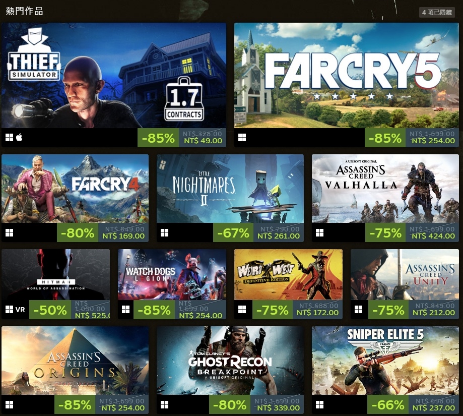夏季特賣結束之後,Steam 在今(25)日推出為期一周的「潛行節」主題特賣活動,針對多款含潛行的主題進行特價銷售。其中包括 Ubisoft 旗下大作《刺客教條》(Assassin's Creed)、《狙擊之神》(Sniper Elite)等系列作品均有歷史新低折扣。
