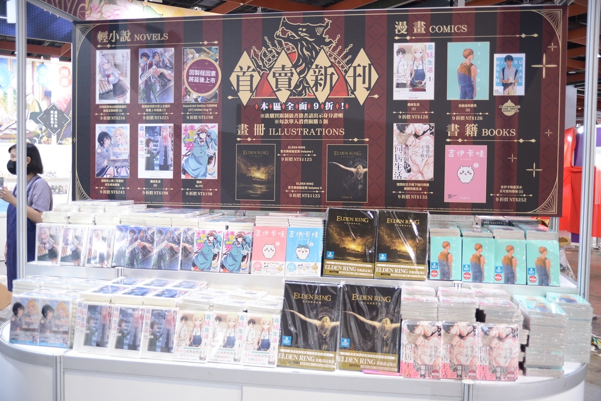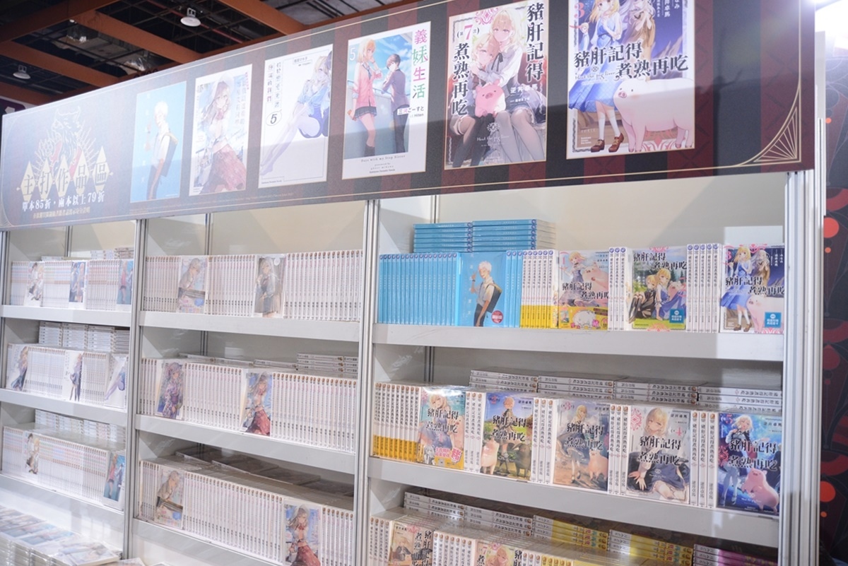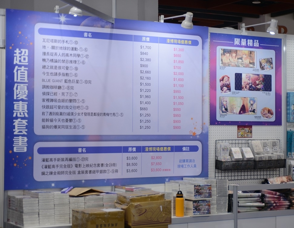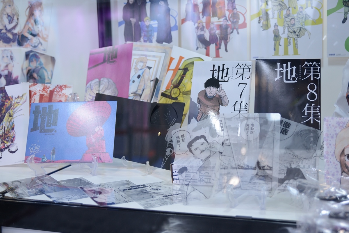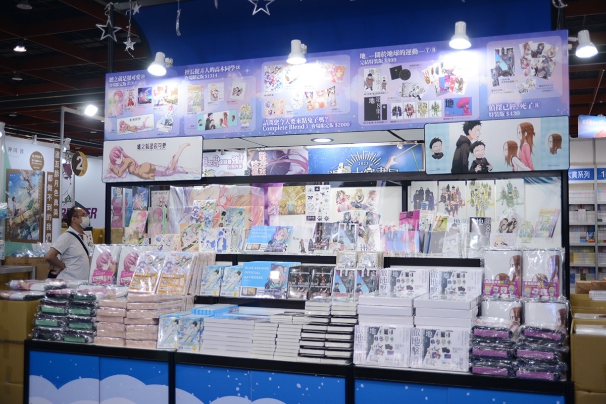 將最注目的書櫃擺得琳瑯滿目,讓讀者可以一眼就看到這次想要搶購的套組有哪些精品,進到攤位就可以拿起並結帳的動線相當優秀!熱門手遊《蔚藍檔案》畫冊也在本場首賣,不少老師們的目標肯定是這本!《地。》簽名會套組現場購買就可參加活動,希望每位粉絲都能無事入手!