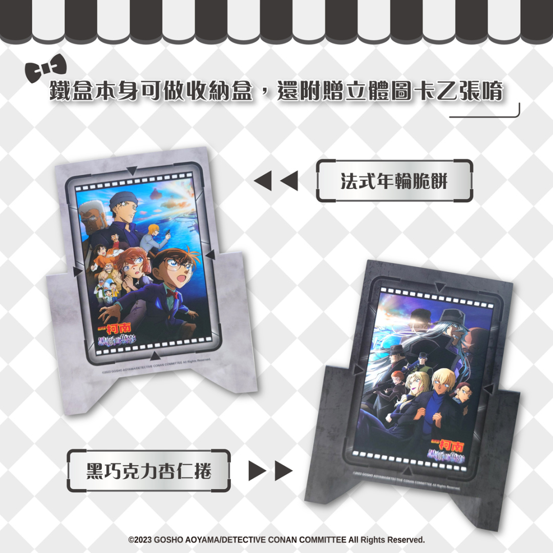 日本官方正式授權、台灣獨家發行,暑假最強電影《名偵探柯南:黑鐵的魚影》注目商品登場!8 月正式推出以《名偵探柯南:黑鐵的魚影》雙主視覺設計的「法式年輪脆餅」及「黑巧克力杏仁捲」鐵盒餅乾,不只美味入口大爆發,精緻鐵盒收納《柯南》小物最對味,每盒均附贈對應電影視覺的立體收藏圖卡,好吃好用好好看,一舉三得 CP 值超高!