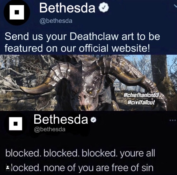 然而這樣的設定,似乎反而引起了某些族群的……性趣,在近日一個專門分享《異塵餘生》系列梗圖和笑話的 Instagram 帳號貼出一張梗圖。圖片內容以開玩笑方式描述開發團隊 Bethesda 徵求死亡爪繪圖,然而隨後即回應「封鎖、封鎖、封鎖,你們通通給我住手,沒有人是無辜的!」,戲稱官方徵求死亡爪創作卻收到一堆相關色圖。
