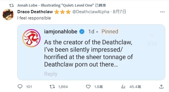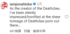 意外的是,這篇純搞笑貼文引來了《異塵餘生4》、《異塵餘生76》死亡爪設計者 @iamjonahlobe 留言,他表示「以一位死亡爪設計者的身份來說,我對外界充斥著龐大死亡爪色情內容默默感到震驚……」