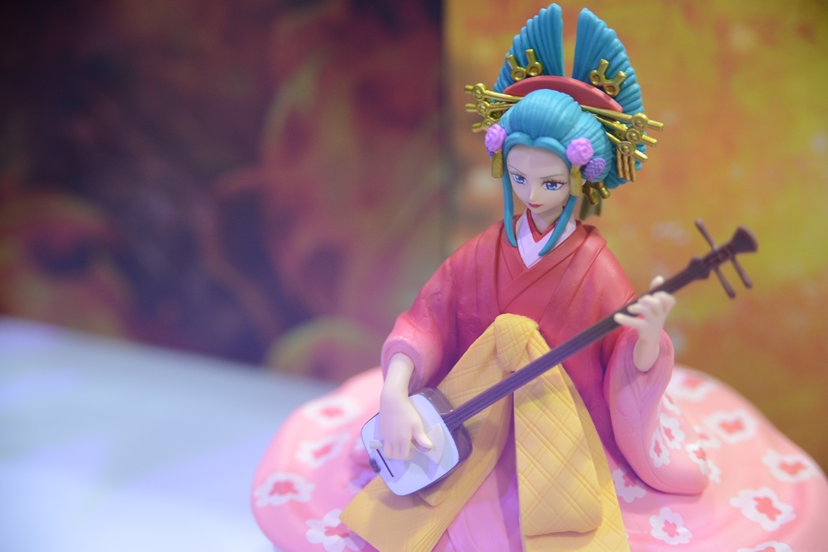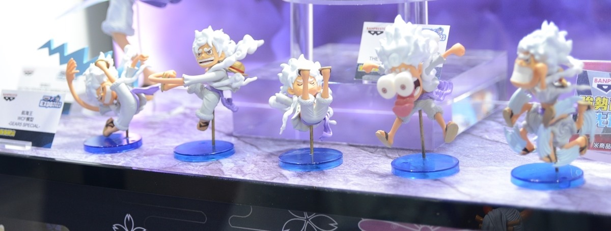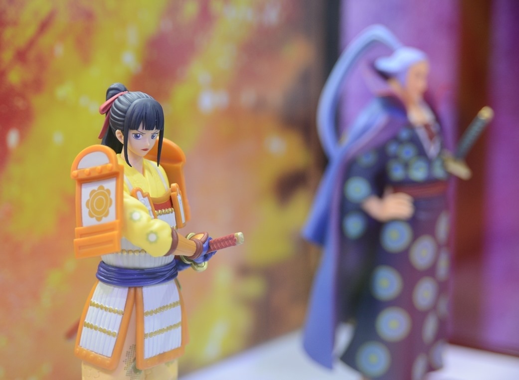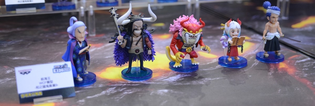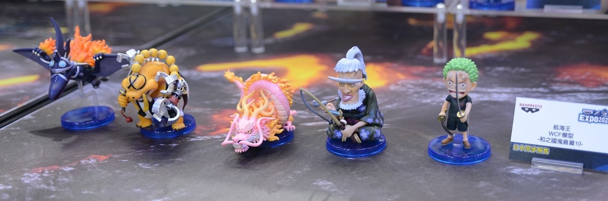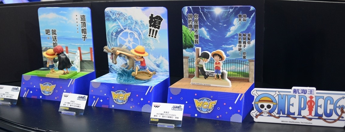 和之國篇目前正是精彩好看的時候,展場中特別擺出魯夫五檔的拍照牆,還有一整櫃的白飄飄魯夫,配合背景拍照效果真好;當然也不能忘記和之國其他重要登場角色,以及在電影版中搶盡風頭的歌姬美音 WCF 系列,「死不認錯~」的手勢,還有小時候的美音以及黑化美音,呈現電影版中美音的各種型態。