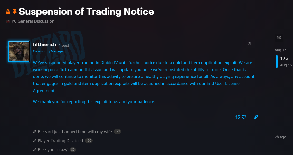日前《暗黑破壞神 4》(Diablo IV)賽季版本中,被發現了 Bug 讓永恆界域的角色「傳送」到惡疫魔賽季界域,在暴雪緊急熱修並且懲處相關玩家後,後續引發的金幣複製漏洞已經嚴重到暴雪今日以藍帖宣布必須暫停玩家交易,直到修正為止。