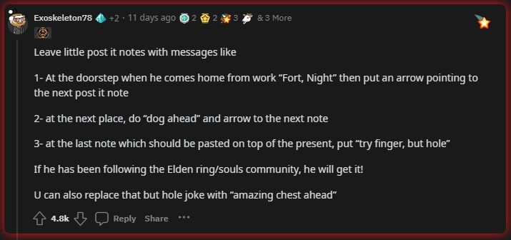 該詢問文受到廣大迴響的同時,其中一位網友回應也獲得多數人推崇。他建議作者可以考慮用便條紙的方式,在不同場所留下不同訊息,引導她老公找到最後寶物,比如「Fort, Night」「Try finger, but hole」等等,「如果你老公有在關注魂系遊戲社群的話,他會懂的。」