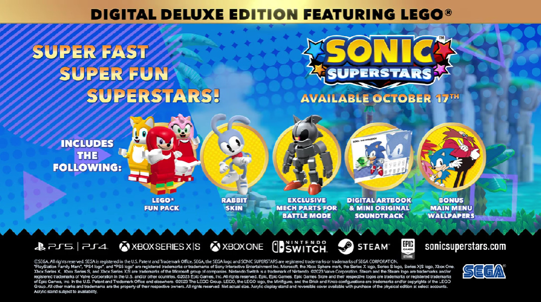 《索尼克 超級巨星》預定在 10/17 日發售,預購遊戲者可獲得 LEGO 風格角色外觀,若購買豪華版則能獲得兔子裝外觀、LEGO 歡樂包、對戰模式用的機械裝備、數位美術設定集與遊戲原聲帶,以及額外贈送的 PC 桌布等豐富特典。