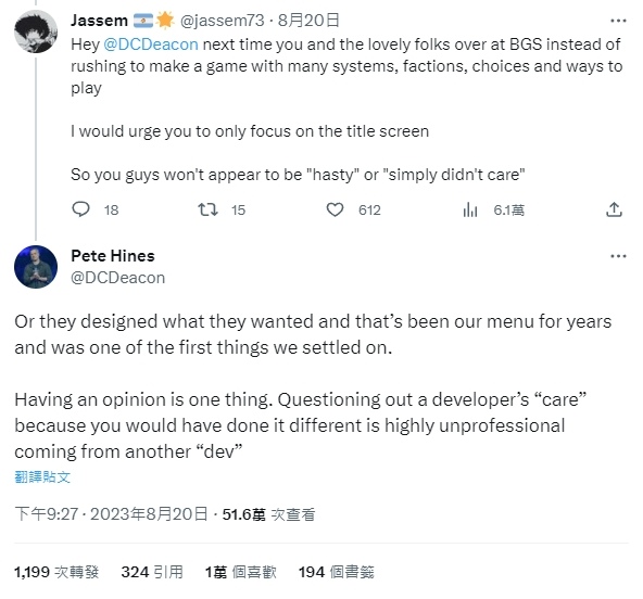 Pete 則對此回應指出,開發團隊設計出他們想要的畫面,「這一直是我們的選單風格,也是最早確認的項目之一。發表意見是一回事,只因為做法不同而質疑同業不用心,這是非常不專業的表現。」