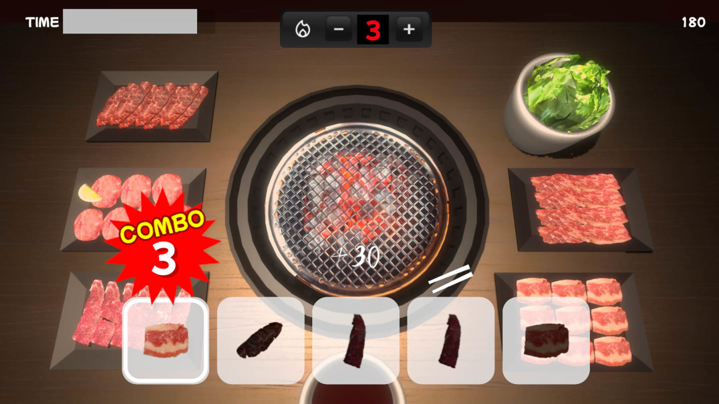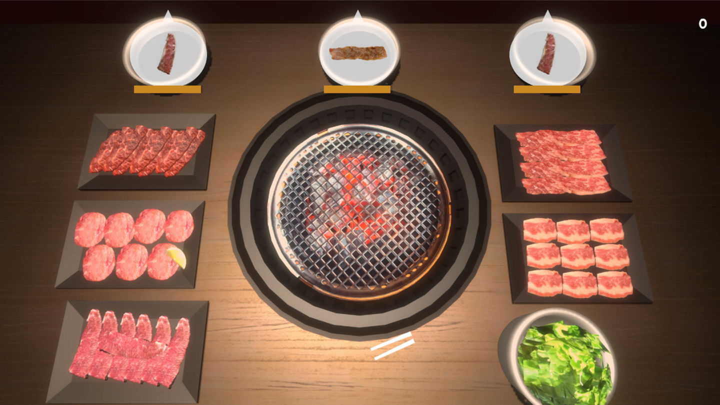 玩家可以在限時內挑戰高分的「得分模式」、盡可能多烤肉並記下抵達目標分數的「計時挑戰」,或是烤到滿意為止的「自由模式」,也能夠透過「連線對戰」和其他玩家來場遠距離燒烤大戰等不同模式裡盡情享受燒肉的樂趣,準備好白飯和飲料來場美味燒肉饗宴吧!