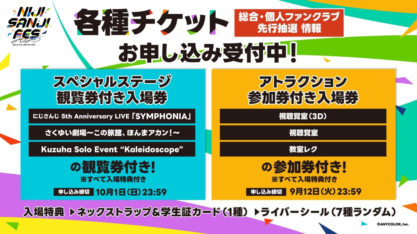 主視覺圖上可以看到包含彩虹社和 NIJISANJI EN 14 位 Vtuber 展現自我、充滿躍動感的模樣,此外包含娛樂設施和特別舞台入場卷在內的活動門票(彩虹社總合、個人粉絲俱樂部先行抽選)自即日起已開賣,前夜祭的預售票則將從 9 月 6 日開賣,期待「彩虹社 FES 2023」的粉絲們不要錯過!