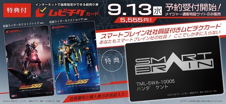 這次所販售的電影卡預售票將是會刻上購買人姓名的「SmartBrain公司社員證電影卡組合」,而且也是數量有限的下單生產商品,預購期間自今天起到 11/13 止。電影卡的設計以兩位升級版騎士為卡面,共兩款,含稅價是 5555 日圓。