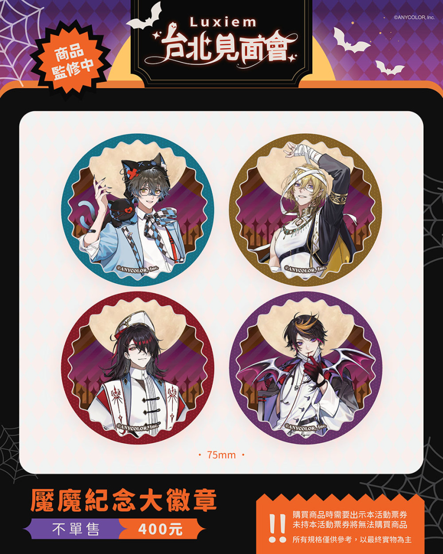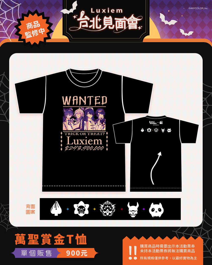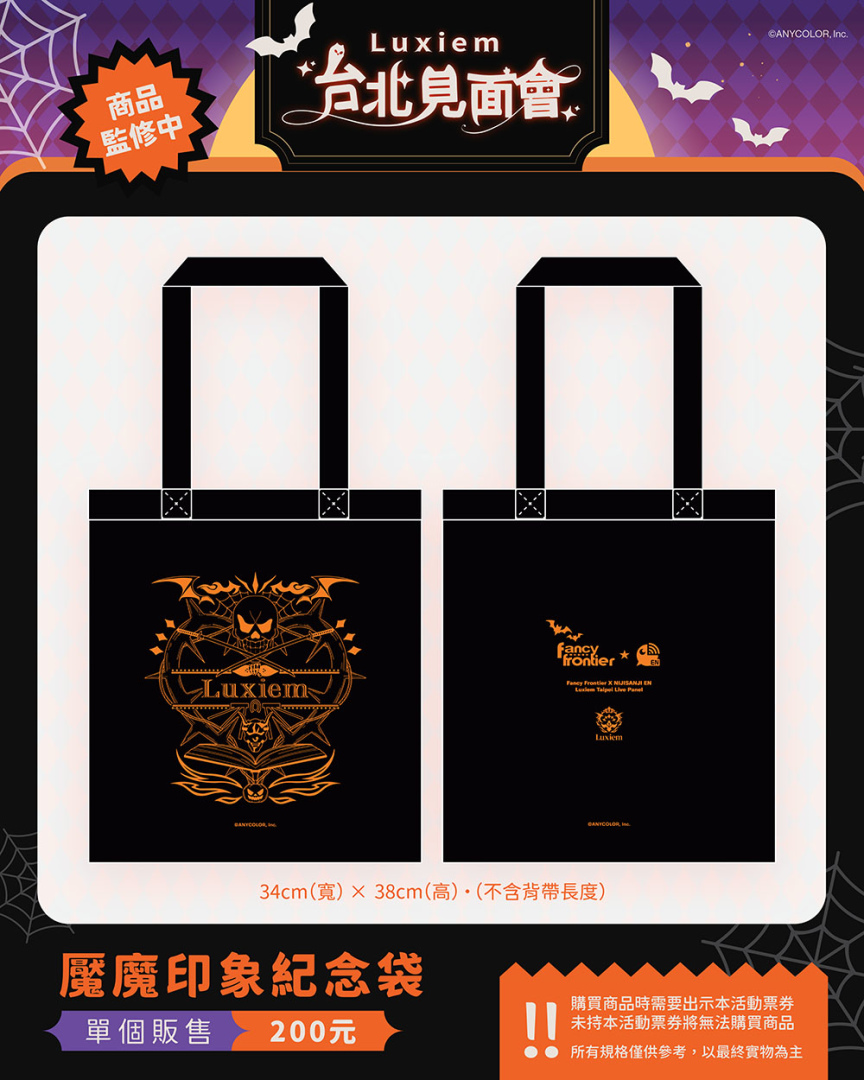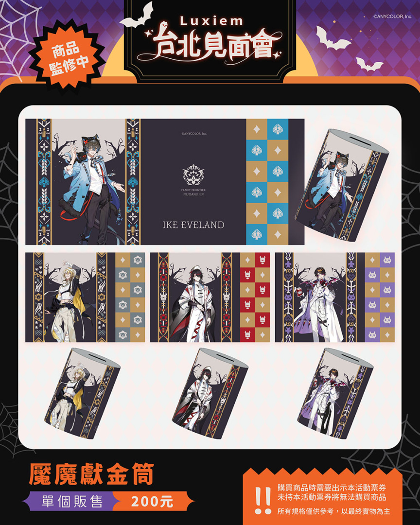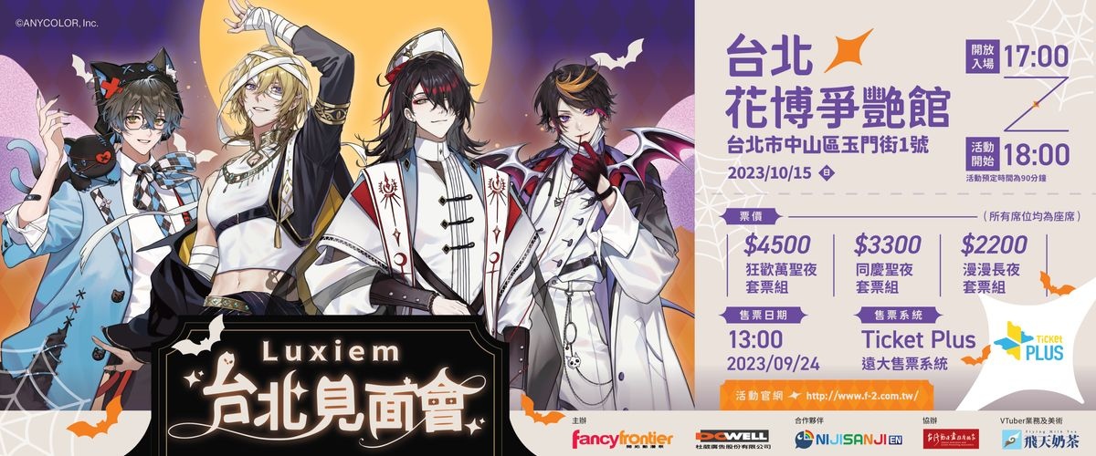 「Luxiem 台北見面會」Fancy Frontier X NIJISANJI EN 門票預計 9 月 24 日下午 13:00 起於「Ticket Plus 遠大售票系統」開賣,全場坐席均採「實名制」,有狂歡萬聖夜套票組(新台幣 4500 元)、同慶聖夜套票組(新台幣 3300 元)、漫漫長夜套票組(新台幣 2200 元)三種價位,不同價位套票所附贈品可到開拓動漫祭官方粉絲專頁或售票網站確認。