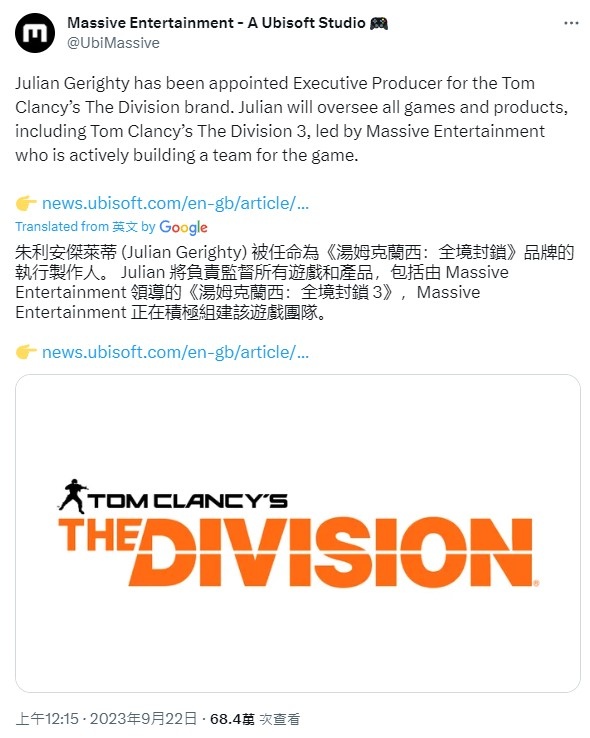 這次的三代開發訊息,是由 Ubisoft 旗下瑞典開發工作室 Massive Entertainment 所屬的「Julian Gerighty」所公開的訊息。他除了表示自己將會擔任《Tom Clancy's The Division 湯姆克蘭西:全境封鎖》品牌的執行製作人外,也將負責由 Massive 領導開發的《全境封鎖3》的製作工作,目前 Massive 也正在積極組建開發團隊要著手進行開發,相信不久後應該就會有更多消息公開。