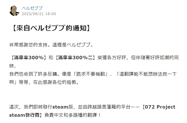 《滿車率300%》以其玩法與作畫於 DLsite 廣受好評熱賣,然而先前曾上架過機器翻譯版收到不少中文區用戶回饋,對於機翻品質表示難以接受。而ベルゼブブ也為此表達誠意於 Cien 發文,表示將與 072 Project 合作帶來中文及其它語言翻譯版本,敬請粉絲們期望之後的正式中文版。