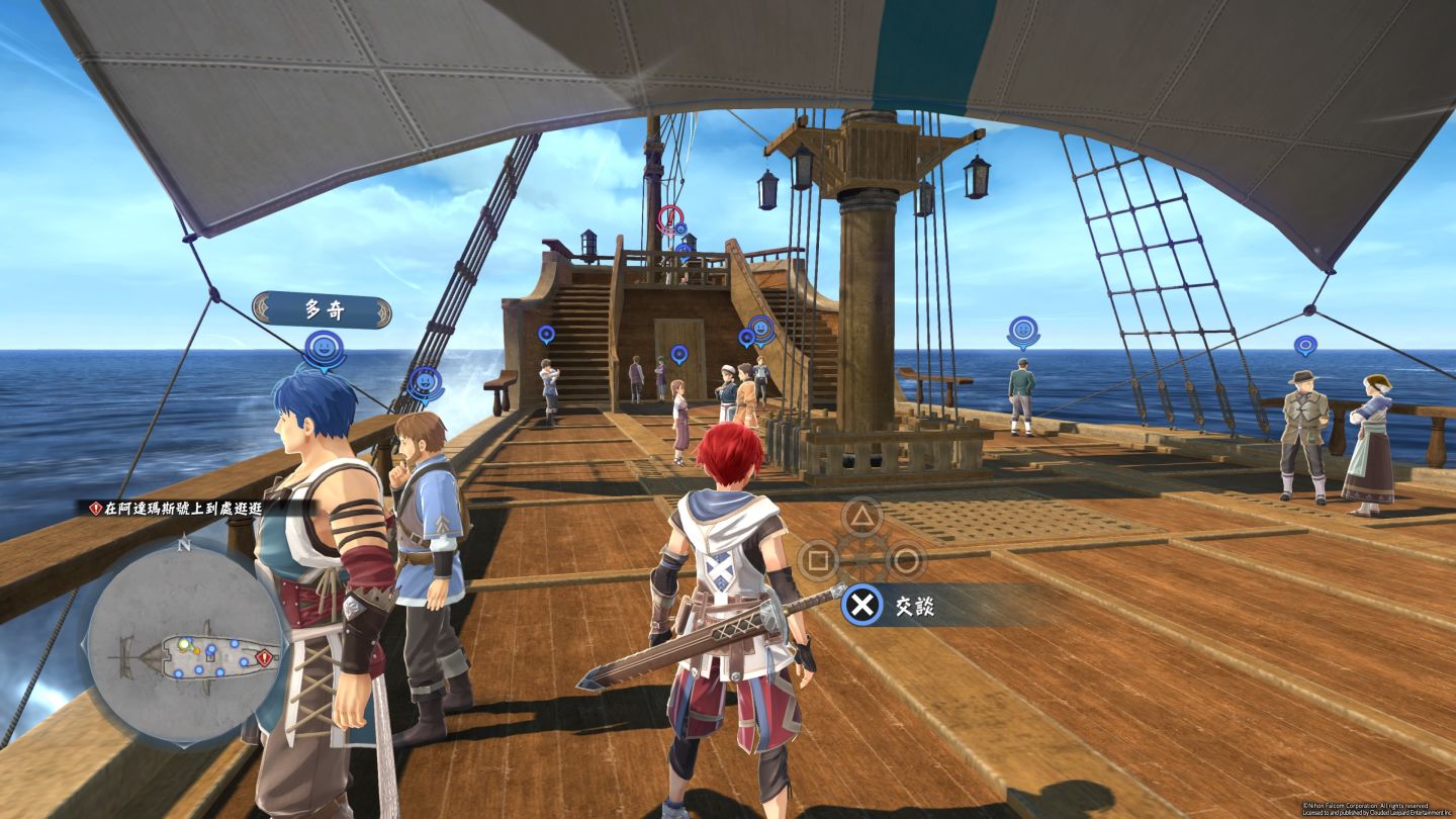 航海時,除了掌舵外也可以到甲板或下船艙與船員們交流或接取委託,而隨船員增加,也會逐步開放商店及船上菜園之類的功能,可以說是亞特魯等人的移動據點。