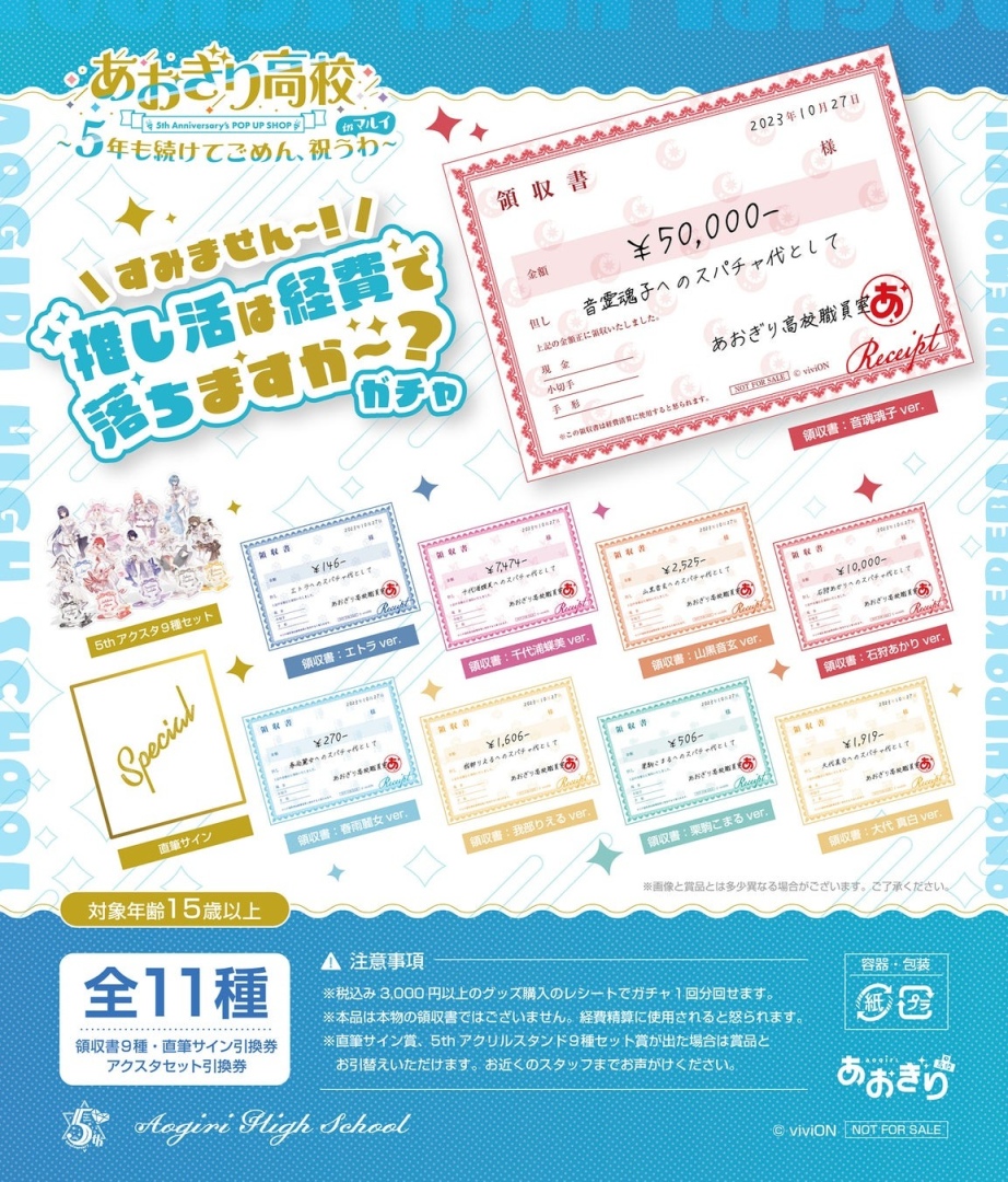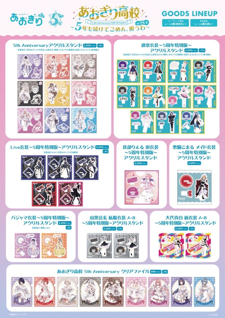 日本 viviON 宣布,旗下人氣虛擬偶像團體「青桐高中」(あおぎり高校)在今年 10 月 27 日迎接成立五週年紀念,將在東京澀谷、大阪難波、福岡博多丸井百貨舉辦「5年も続けてごめん、祝うわ」快閃店活動。