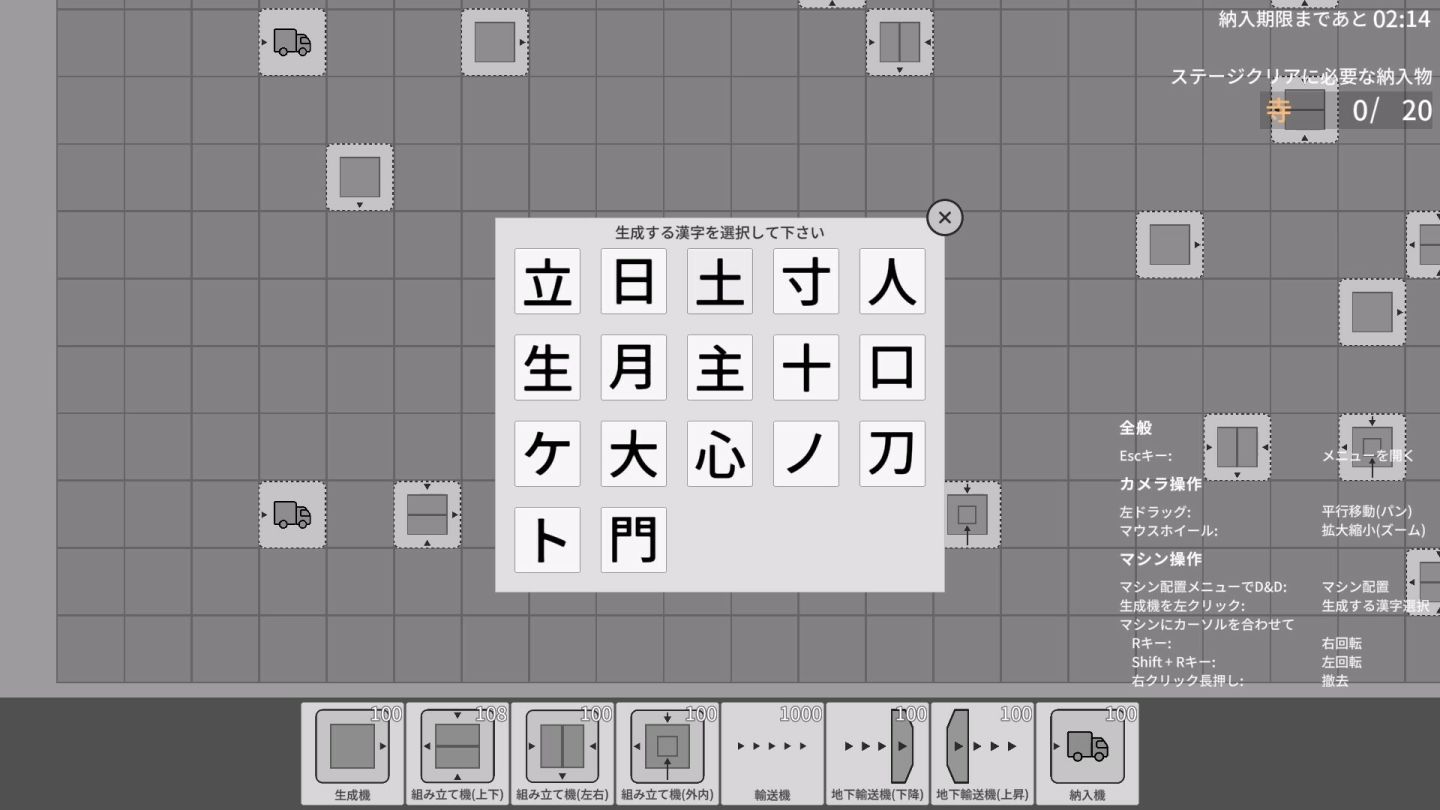《Kanji Industry》是一款以「漢字」為主題的生產自動化遊戲,玩家在遊戲中要經營一個漢字組裝工廠,工廠中的設備會包含生產漢字的製造機、運輸漢字的運輸機和組裝不同漢字產生新字的組裝機,玩家要一邊生產不同的漢字並逐步擴大工廠規模實現產線自動化。