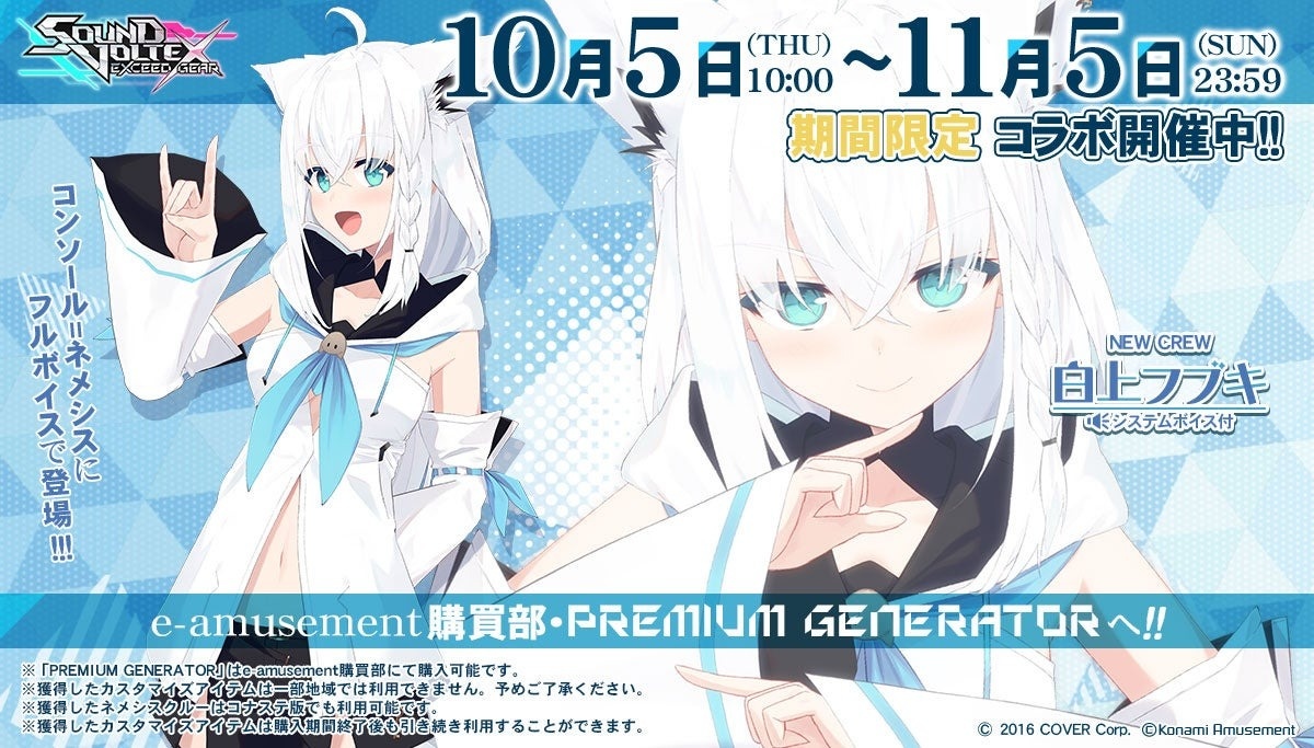 與合作相關的遊戲內道具也會在電子服務「e-amusement 購買部」中做為「PREMIUM GENERATOR」限時販售,除了白上吹雪會化身為遊戲導航員登場外,還將附帶為合作所錄製的新語音貼圖和觸控螢幕壁紙,完成「PREMIUM GENERATOR」的玩家可以獲得白上吹雪聯名的 e-amusement 通行證卡片,喜歡《SOUND VOLTEX》系列的玩家和白上吹雪的粉絲們不要錯過!