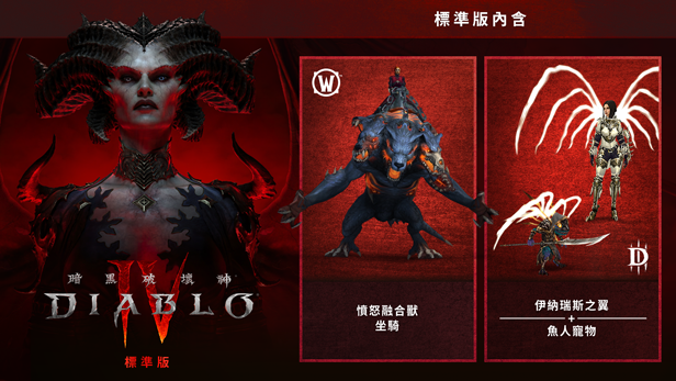 在《暗黑破壞神4》中,玩家將加入保衛聖休亞瑞的戰鬥,迎接這場終極的動作角色扮演冒險,體驗劇情任務以及全新賽季的豐富內容。同時在這次 Steam 推出的標準版中,除了遊戲本篇外,還將會收錄《暗黑破壞神3》的伊納瑞斯之翼與伊納瑞斯魚人寵物、《魔獸世界》的憤怒融合獸坐騎等特典同梱。
