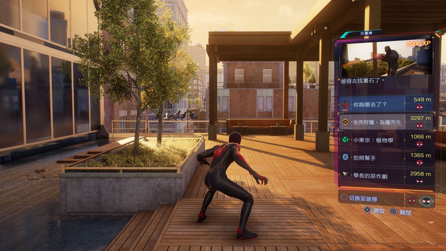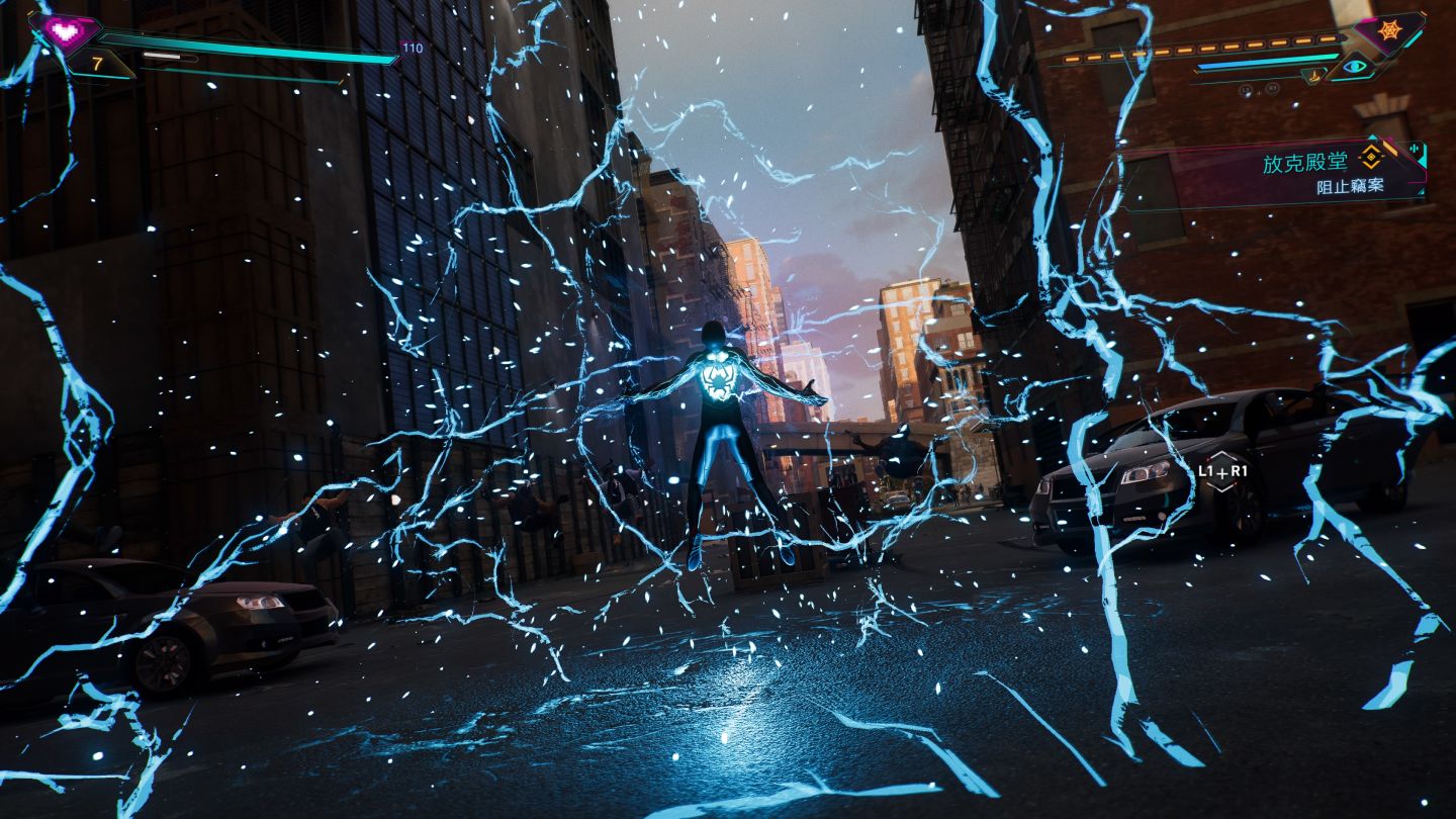 不過一但解鎖「快速移動」功能,就能感受到 PS5 效能的強大,本作玩家是可以在該區地圖介面上的任何角落按下快速移動,就出現在地圖所代表的遊戲區域,而非固定點的傳送效果。這在許多開放世界遊戲中是以定點傳送截然不同。因此在切換不同角色時也是畫面一閃就無縫換人,只可惜的無法達成彼得在曼哈頓、而邁爾斯在布魯克林區的跨區無縫切換,自由切換蜘蛛人的效果除非是主線需求,否則只能在同區進行,無法跨區雙人切換。