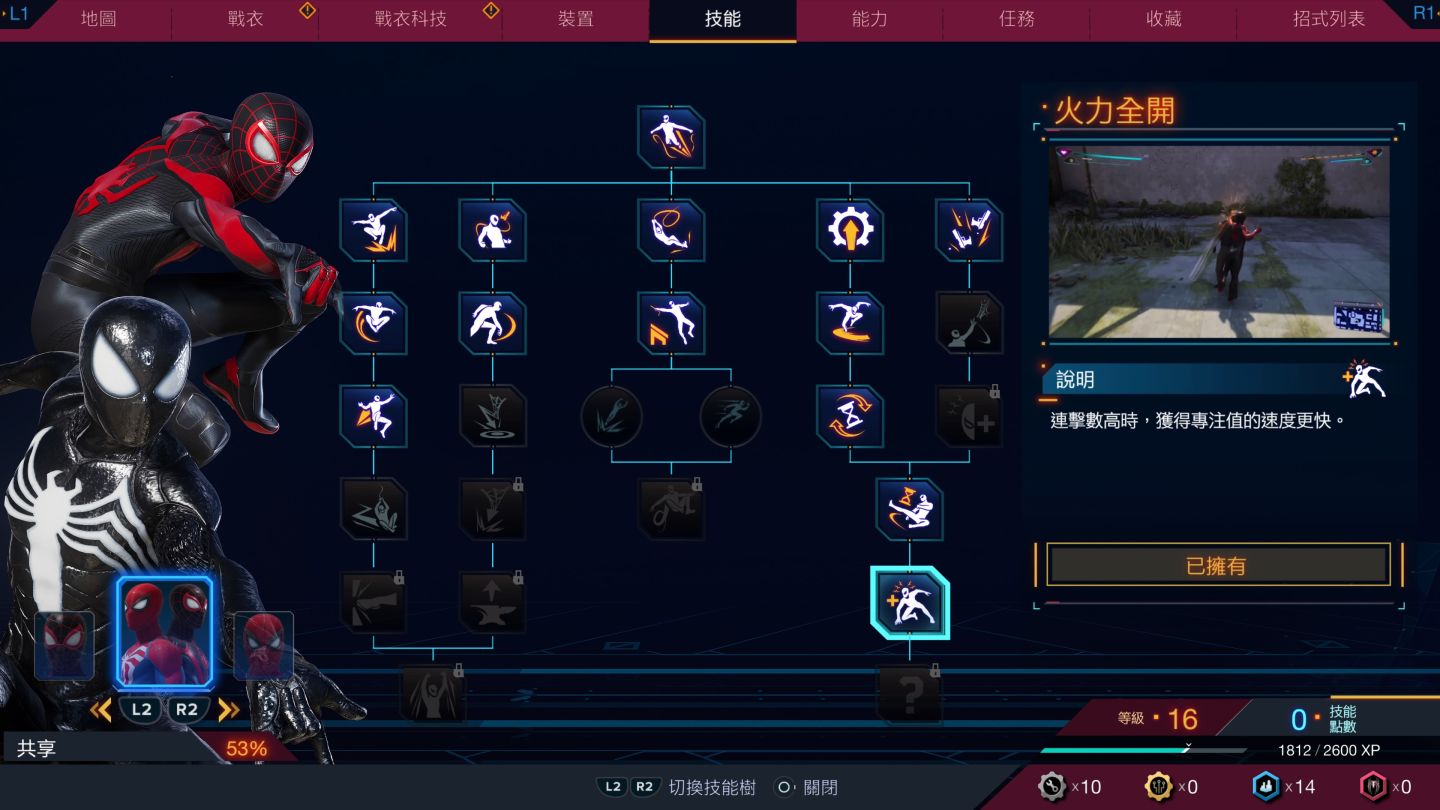 彼得與邁爾斯各自的能力則以 L1 呼叫熱鍵施展,彼得以他特化的空戰加共生體能力,而邁爾斯則是毒液電流得到新強化。技能樹也分為了兩人共通體術的「共享」及彼得、邁爾斯共有三種技能樹可以讓玩家投資,更新增了「格檔」動作,讓玩家除閃躲外還可用格檔來破解敵人攻擊,因此不管是匿蹤還是正面戰鬥,都有更多暢快的玩法與節奏,且對應著 DualSense 的同步振動回饋,模擬拳拳到肉的打擊感。
