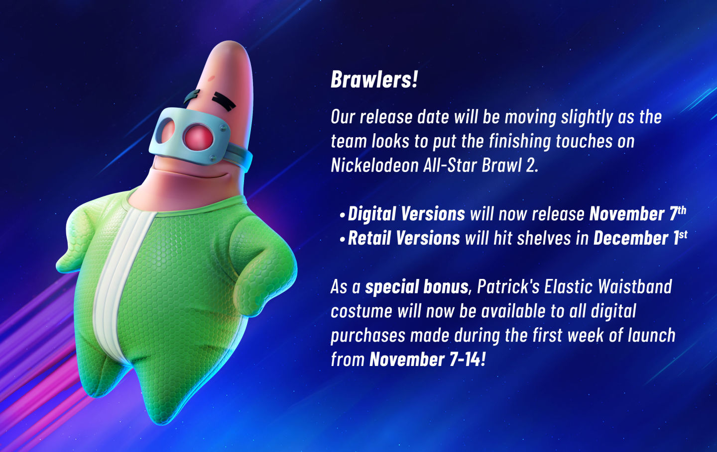 Ludosity 開發、GameMill Entertainment 原本預定於 2023 年 11 月 3 日起,在 PC Steam/Nintendo Switch/PS4/PS5/Xbox One/Xbox Series X|S 等平台上推出的對戰動作派對格鬥遊戲《Nickelodeon All-Star Brawl 尼克卡通全明星集結大亂鬥2》數位版,將決定延後至 11 月 7 日推出零售版則是將於 12 月 1 日上市。
