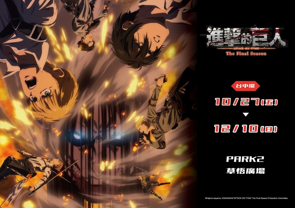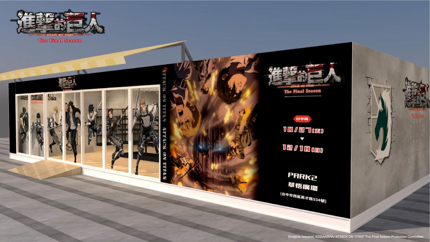 | 進擊的巨人 The Final Season 快閃店 展覽日期:2023年10月27日 – 2023年12月10日 展覽地點:PARK2草悟廣場(台中市西區英才路534號) 營業時間:週一至週五 11:30-20:00、週末及例假日 10:30-20:00 |