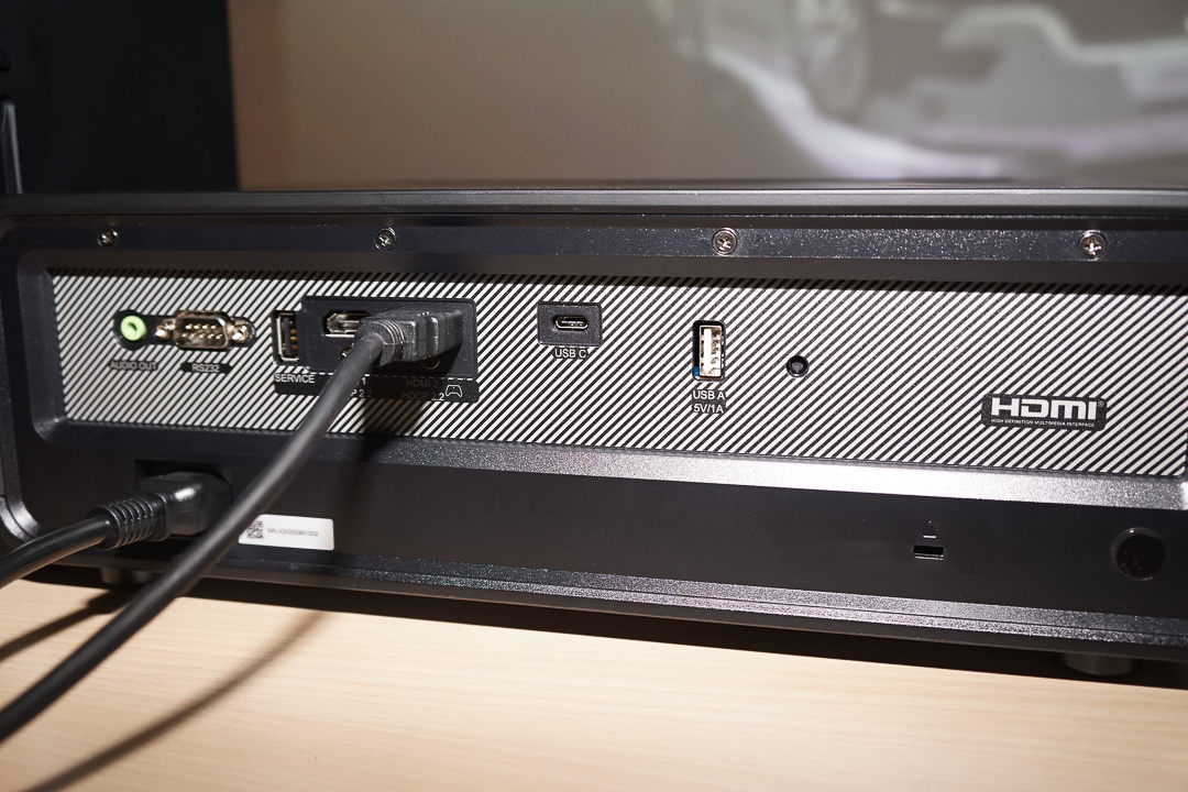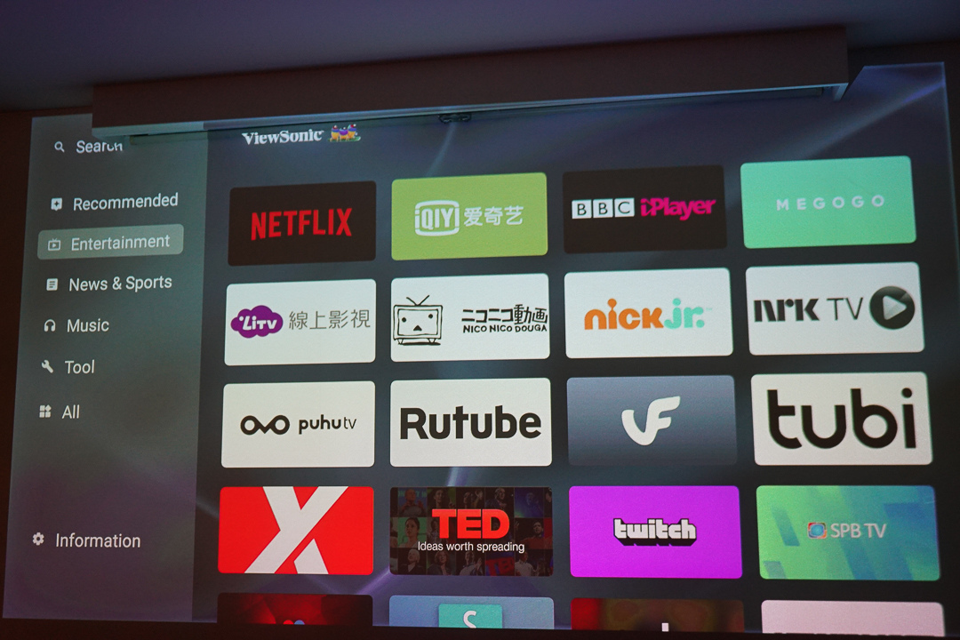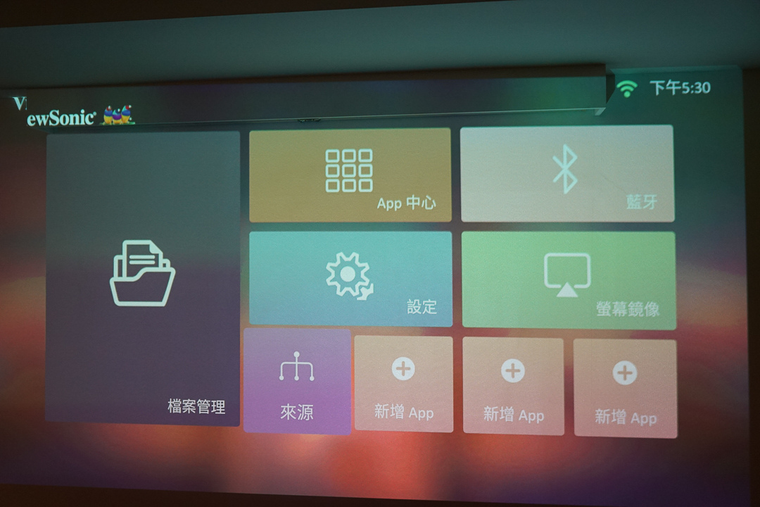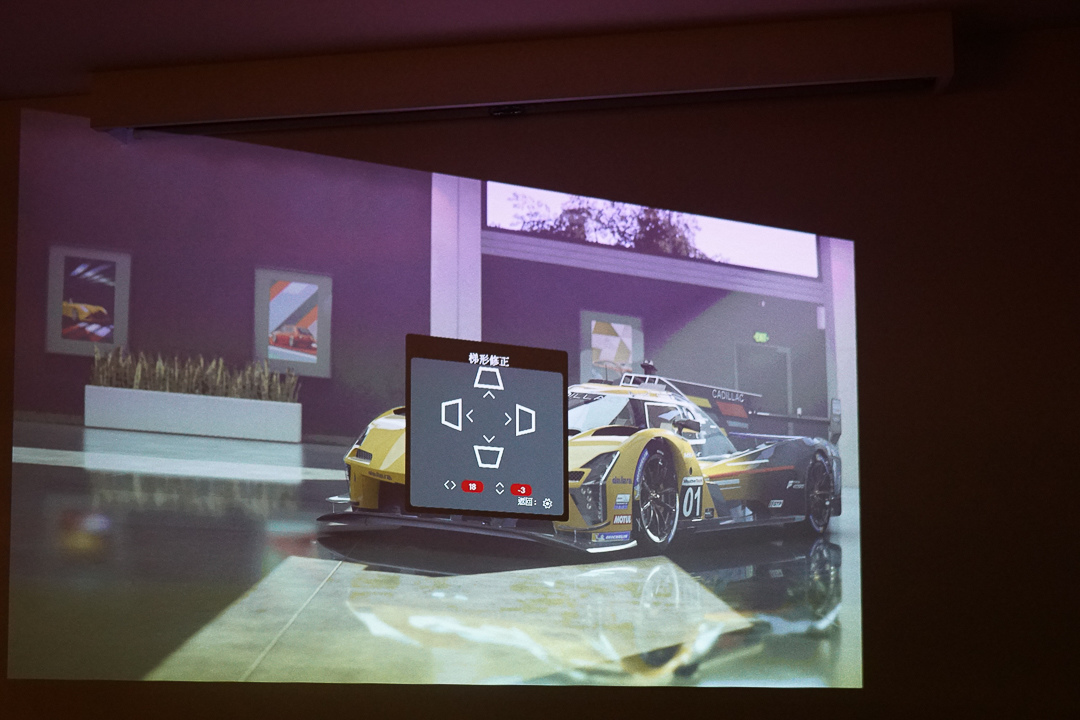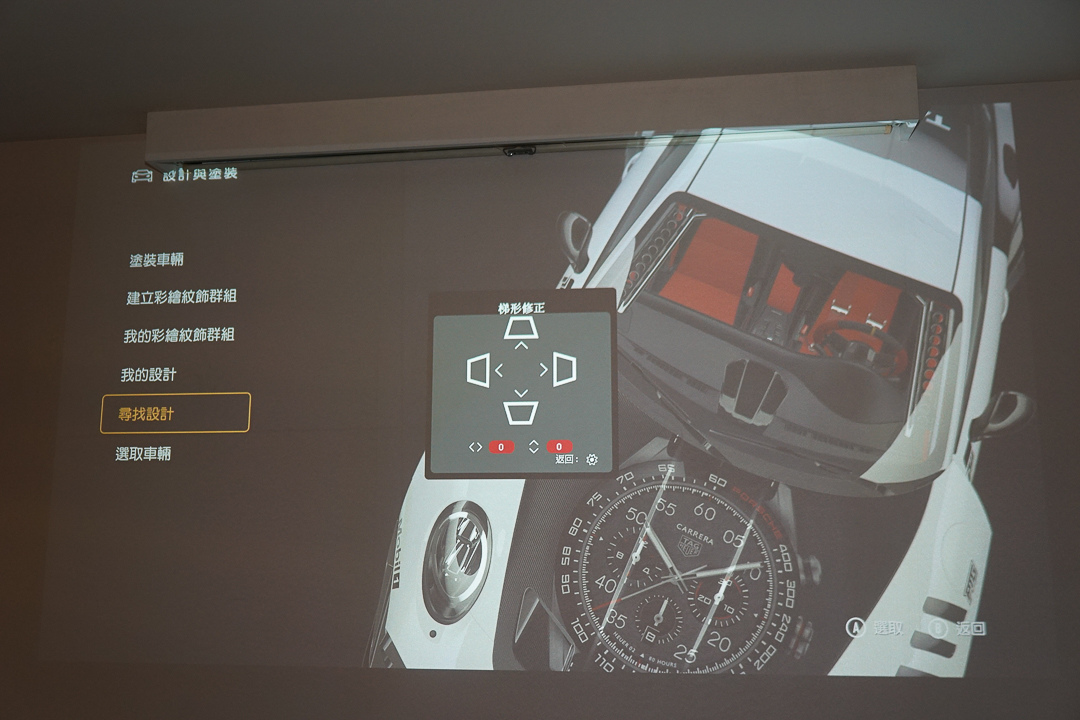 在短焦設計下,可以讓狹小的空間只要有足夠大的牆面就能呈現大螢幕的效果,而且投影機具備的「梯形修正」可以讓玩家在無法垂直投影時,調整出適合的投影方向,對齊效果可以水平與垂直正負 40 度,讓玩家獲得完整的螢幕尺寸。