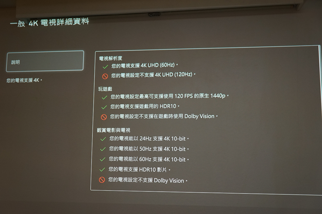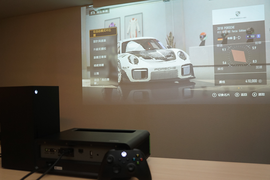 X2-4K 的特色是在於針對 Xbox 主機特有的 1440P /120 Hz 模式支援,但不是所有的 Xbox 遊戲都能以此模式運作,所以一時間要找到適合的遊戲呈現投影機的支援性較為困難。在 4K HDR / 60 Hz 的模式顯示下,對於遊戲的輸入與影像的呈現延遲性確實比一般投影機來的低許多,如果切換成更低解析度高更新率的模式,遊玩如《極限競速》的賽車遊戲感受到的延遲差異會更明顯。