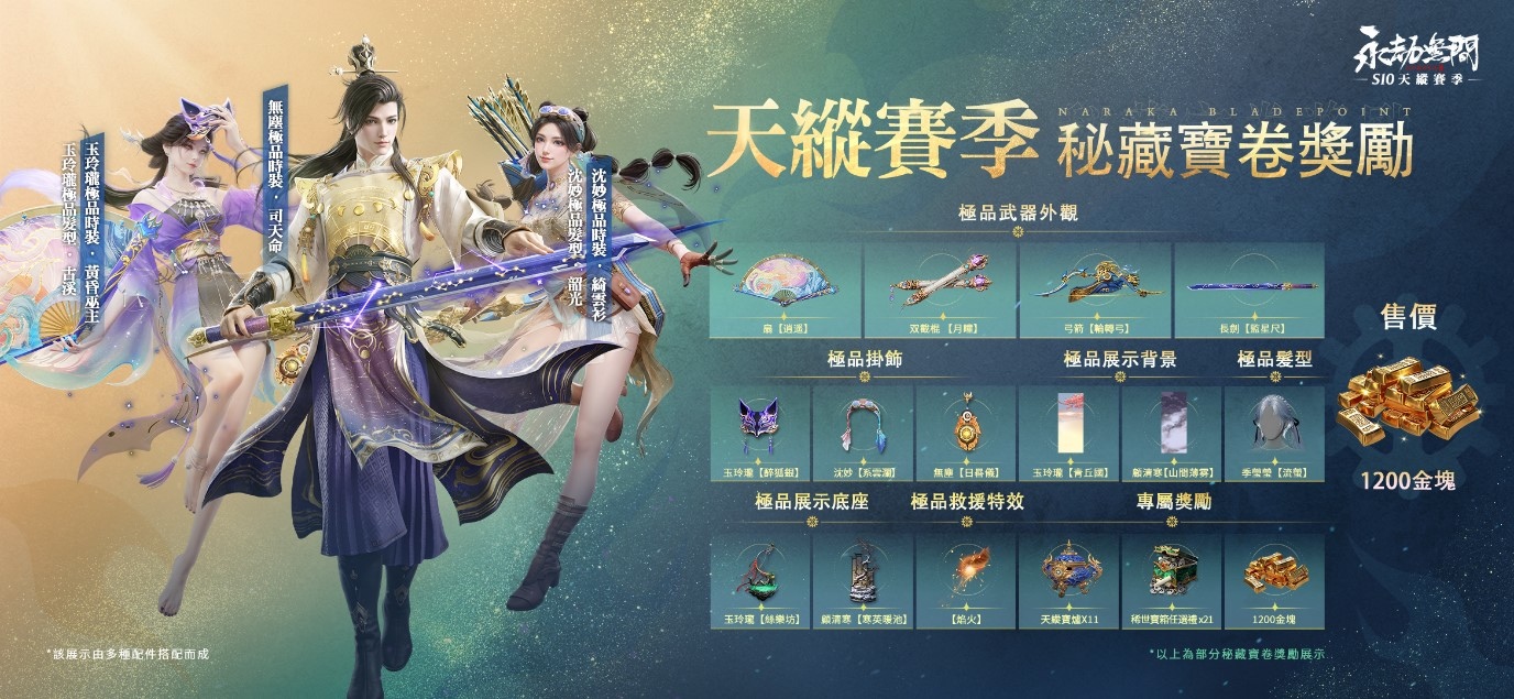 《永劫無間》S10 天縱賽季揭開帷幕!賽季時間於今日起至 2024 年 1月 4 火熱進行中。天縱賽季將帶來專屬通行證,只要玩家每天完成任務,即可獲得通行證經驗值,並隨著等級提升,將解鎖更多珍貴的虛寶獎勵。其中包括「無塵時裝-司天命」、「玉玲瓏時裝-黃昏巫主」、以及「沈妙時裝-綺雲杉」等華麗時裝,還有多款炫麗武器外觀和特殊道具等待玩家們來收藏。