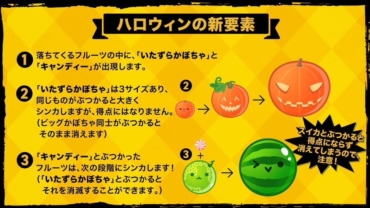 本次更新過後,可以從標題畫面按 R 鍵切換到萬聖節版本,掉落的水果中出現了期間限定的「搗蛋南瓜」和糖果,搗蛋南瓜分成三種尺寸,與水果一樣同樣的東西黏在一起會進化成更大的南瓜,但進化時不會獲得分數,最大尺寸的南瓜碰撞在一起則會直接消失;糖果則是會讓碰到的水果直接進化成下一階段,若碰到搗蛋南瓜則會讓其消失,要注意的是西瓜碰到南瓜的話不會獲得任何分數並直接消失喔,趕快來挑戰與平常西瓜遊戲氛圍截然不同的「南瓜遊戲」(カボチャゲーム)吧!