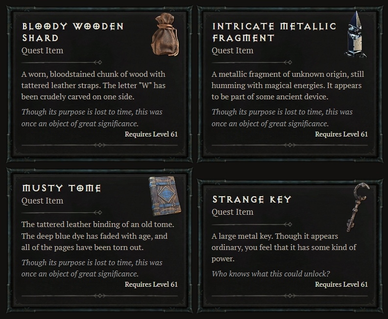 根據 Wowhead 解說流程,首先玩家必須取得合成鑰匙的三件道具,包括「染血的木頭碎片」、「精細的金屬碎塊」、「發黴的書籍」。這三樣道具根據描述,可以很明顯看出對應當時二代開啟傳送門所需的物件。