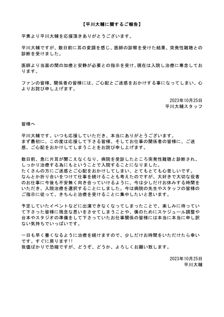 聲優平川大輔於官方X(推特)上發出告知,因聽力障礙問題將暫時靜養,也將暫時停止聲優活動。