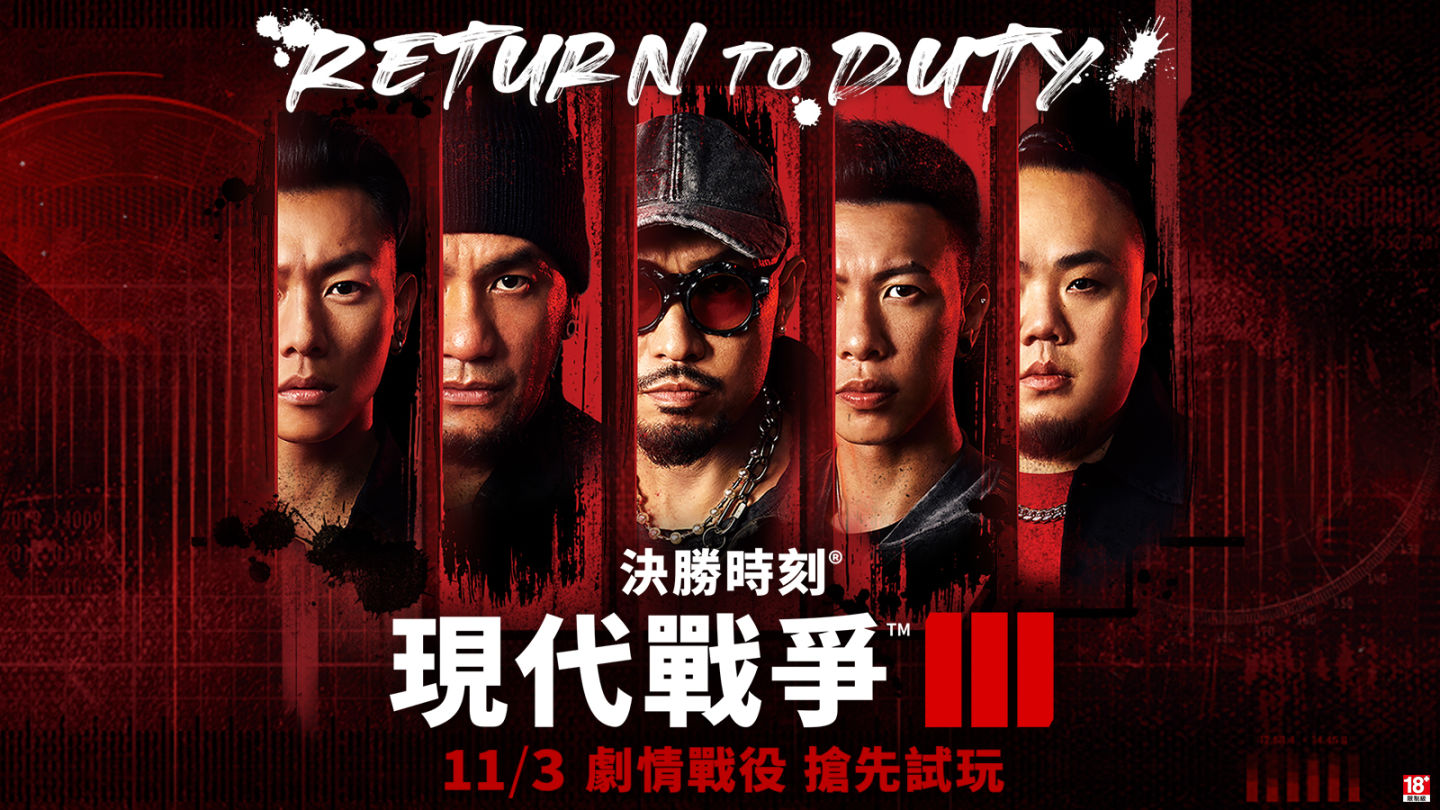為迎接《現代戰爭 III 2023》於 11 月 10 日盛大發行,音樂鬼才張震嶽、嘻哈教父 MC HotDog 熱狗,及最潮嘻哈組合頑童 MJ116,合體打造一首融合「兄弟本色」風格及《決勝時刻》特色的全新單曲〈Return to Duty〉。