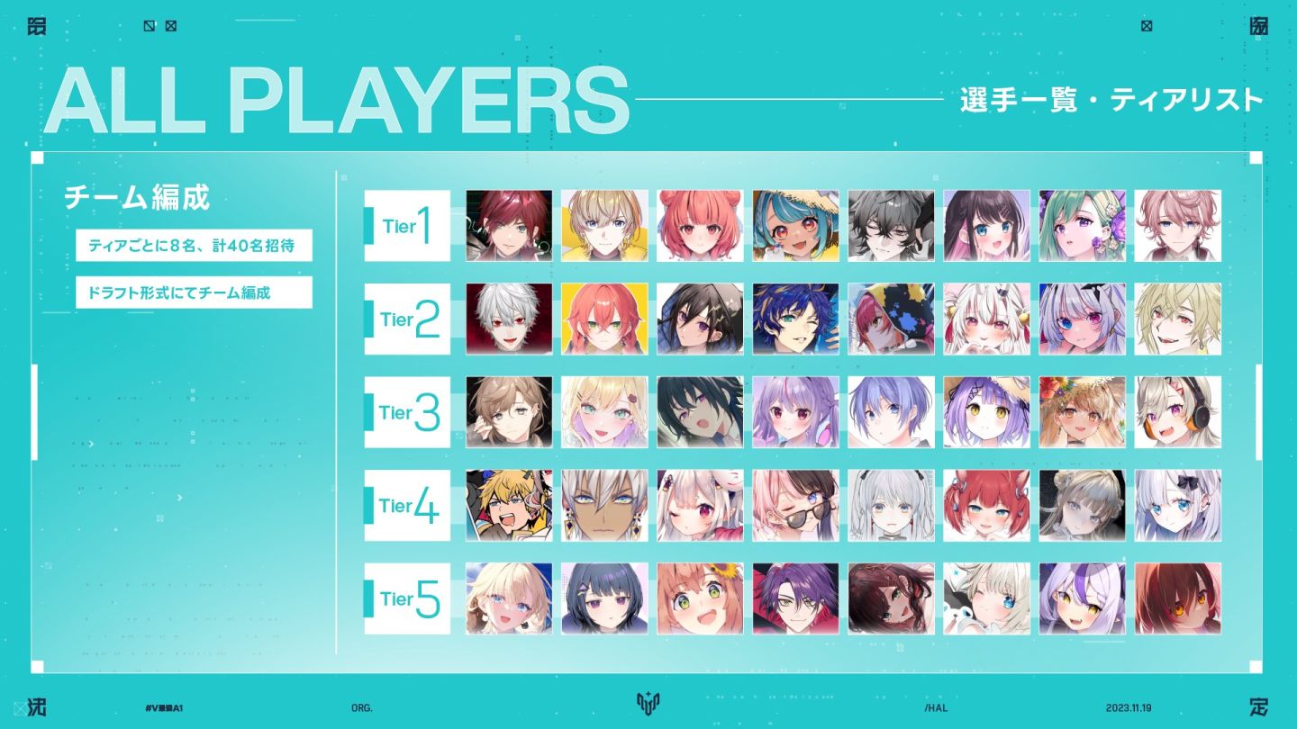 本次「Vtuber 最協決定戰 ver.VALORANT Act1」將參加者分成 Tier1~Tier5 五種等級,每個級別各有 8 位 Vtuber 參加,之後會以選秀形勢決定 8 支隊伍的分配,參加成員名單如下: