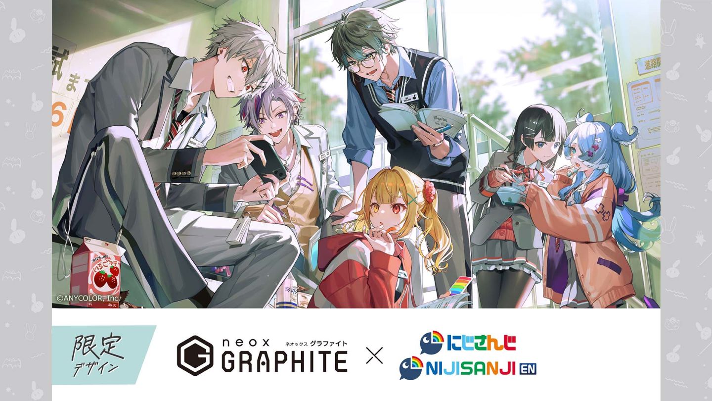 本次參與的 Vtuber 包含來自彩虹社的月之美兔/葛葉/不破湊/星川莎拉,以及 NIJISANJI EN 的 Ike Eveland 和 Elira Pendora,邀請到人氣插畫家「およ」繪製以「GRAPHITE 學校」為主題的主視覺圖,並以此為設計推出三種聯名商品。