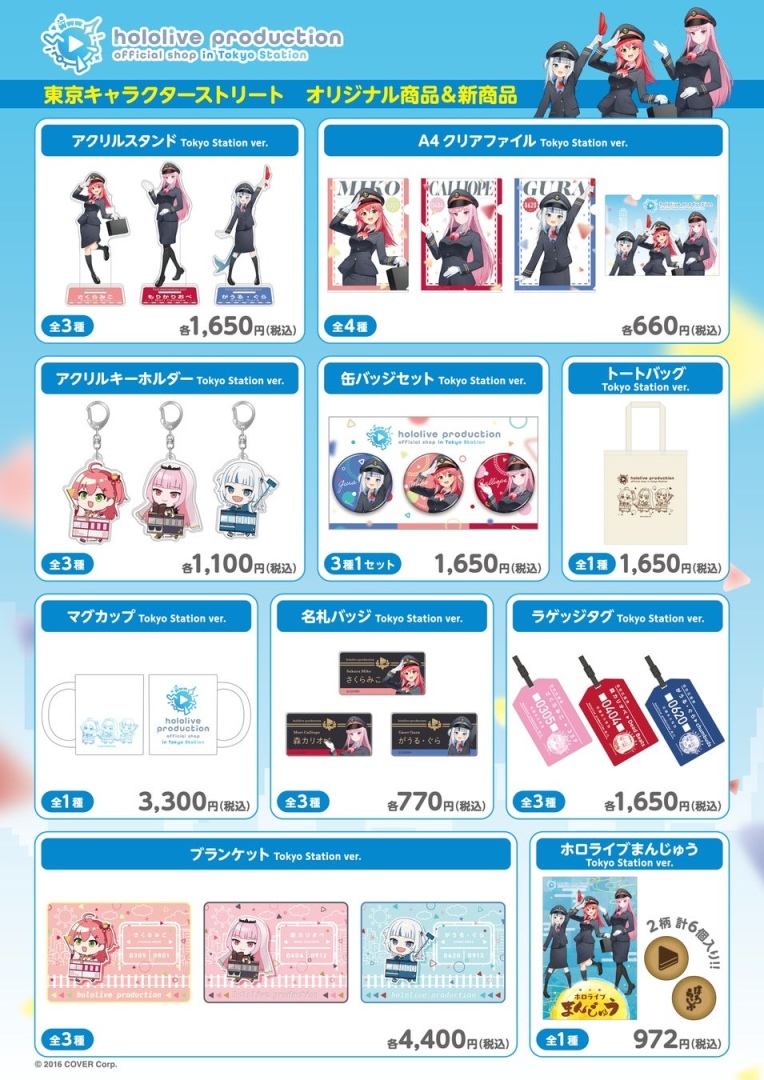 在本次活動中,hololive 三位東京觀光大使櫻巫女、噶嗚.古拉、森美聲換上了由人氣插畫家「成田タメゾウ」所繪製的新形象造型,並以此為設計推出新的原創周邊;有常見的壓克力立牌與徽章,以及馬克杯、名片造型徽章與印有 hololive 標誌的饅頭點心,除了新推出的周邊以外,店內也會販售過去只在 hololive 官方商店中出售的精選商品。