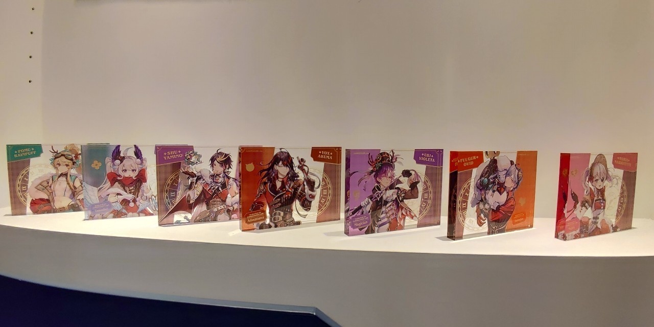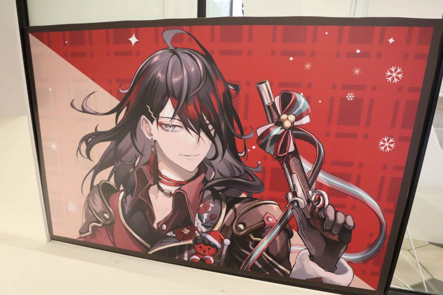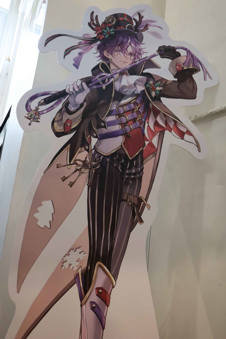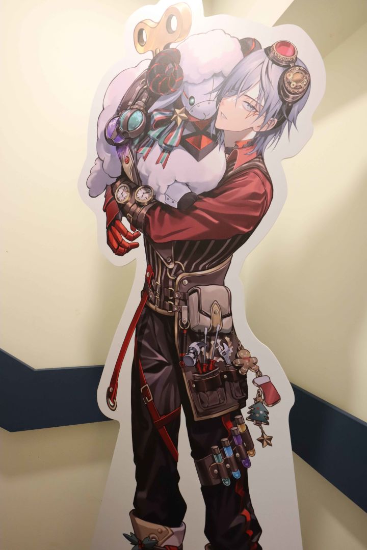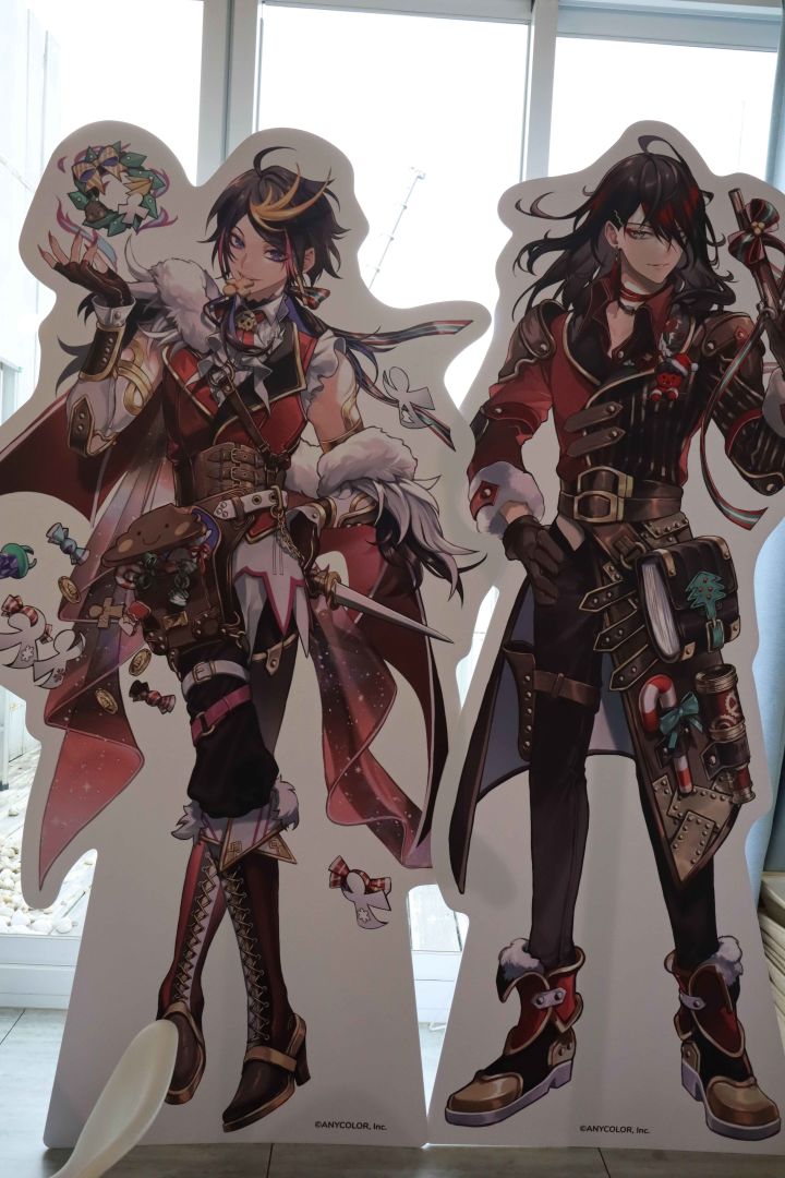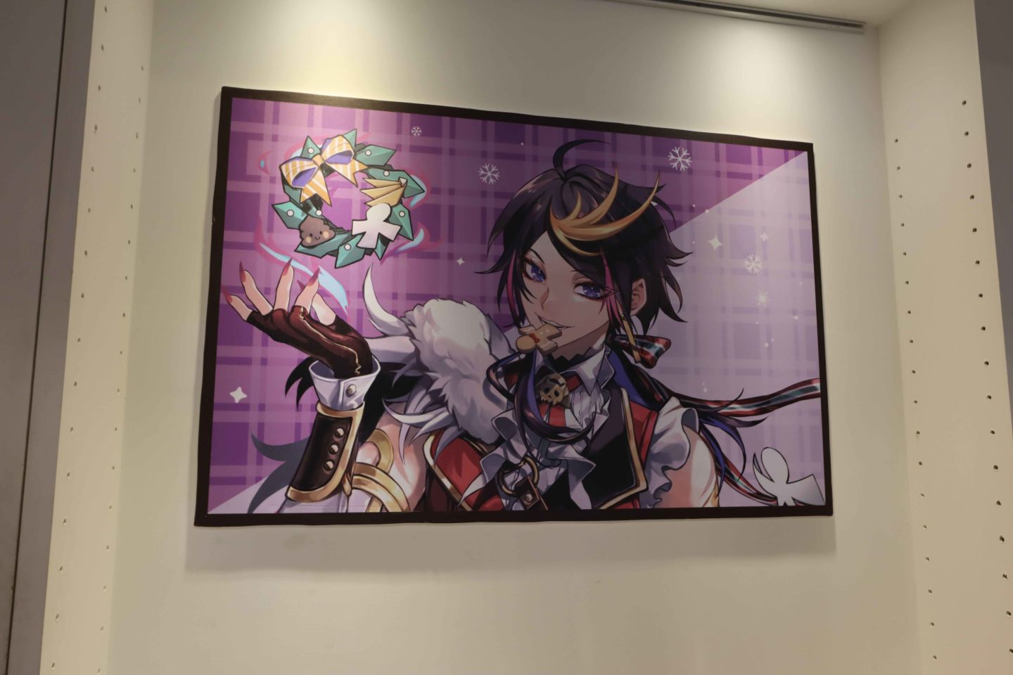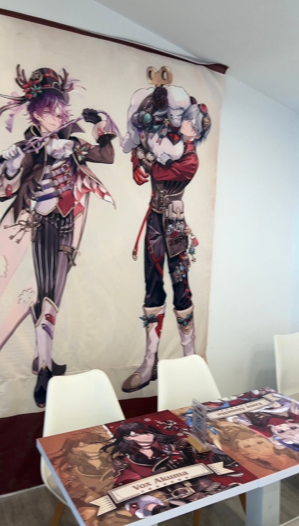 樓梯兩側放著 Shu Yamino 和 Vox Akuma 的半身照和所有人的壓克力磚做裝飾