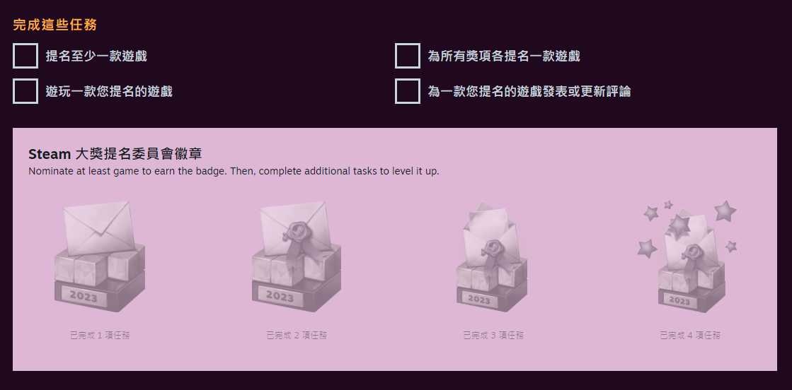 Steam 現已展開 2023 年秋季特賣,為期一周至台灣時間 11 月 29 日上午 2 時結束。除了慣例季節大特價之外,2023 Steam 年度遊戲大獎提名也同步開跑,在提名活動頁面可為今年共 11 個獎項提名,包括首次開設的「最佳 Steam Deck 遊戲獎」。另外只要完成提名相關任務,即可獲得本次秋季特賣的 Steam 大獎提名委員會徽章,全部完成後共可增加 100 帳號經驗值。