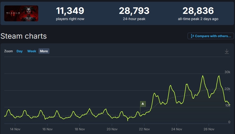 拜免費活動與 6 折特價所賜,根據 SteamDB 網站顯示,Steam 版本《暗黑破壞神4》也在該周內突破過往同上記錄,最高達到 28,836 人次。由於 Battle.net 版本早了 4 個月發售,Steam 版本推出後同上未曾破萬,此波促銷顯然為 Steam 版本帶來不少人氣。