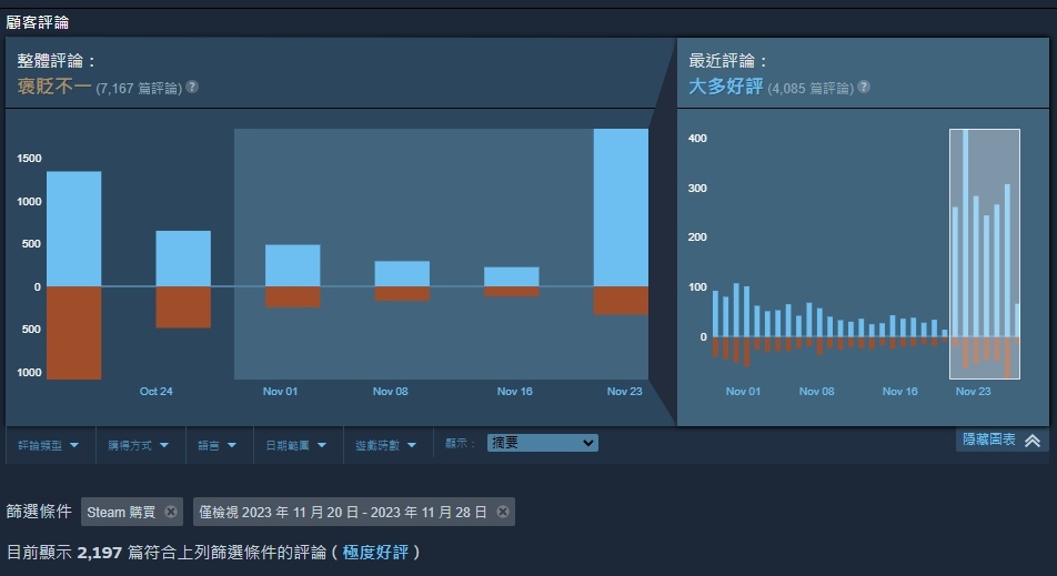 不過相對於《鬥陣特攻2》慘烈狀況,《暗黑破壞神4》免費期間湧入的評價卻是帶來大量好評數,負評中主要對 20 滿級即被踢出無法登入、連線與斷線問題、白金幣購買等表現不滿,但整體評價依然正面居多。就 11 月 20 日至 28 日評價,甚至達到 84% 極度好評成績。