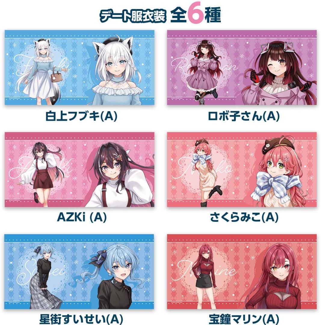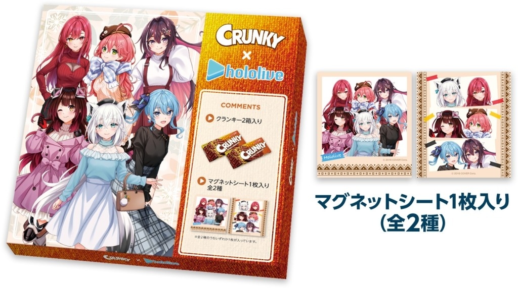 除了上述限定周邊以外,還會推出合作食品與壓克力杯墊、立牌、徽章、交換式卡片等原創周邊,除了 LAWSON 店鋪販售外,也會在「@Loppi」、「HMV」、「BOOKS online」開放預購,並販售各 Vtuber 的「推活套組」,凡購買者可獲得大毛巾兩款、壓克力畫板、滑鼠墊兩款和大型壓克力立牌兩款。
