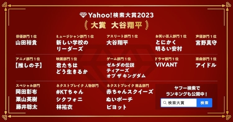 「Yahoo!搜尋大獎」是以前一年的搜尋量當作對照,將今年內搜尋數急速攀升的人物、作品、產品等以排名形式表現出來的獎項。動畫分類中得到第一名的《【我推的孩子】》,是在 2023 年 4 月到 7 月播出動畫版,不僅有加長時間、如同電影內容般戲劇化又衝擊的第一集,還請來人氣雙人組合 YOASOBI 量身訂做主題曲〈IDOL〉,這首歌曲也獲得音樂分類的第一名,至今依舊高掛於各大單曲排行榜前十名以內。動畫分類第二到第五名分別是:《藍色監獄》、《葬送的芙莉蓮》、《地獄樂》、《鬼滅之刃 刀匠村篇》。