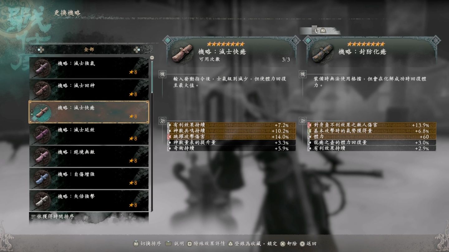 「機略」有不同的屬性效果搭配更強力的技能,像是一瞬間累積生命/氣勢最大值、提升傷害,甚至還有化解時可捕血、無敵等效果,可以用來攻略高難度關卡,同時也具有裝備詞彙,可以提升角色的戰力。