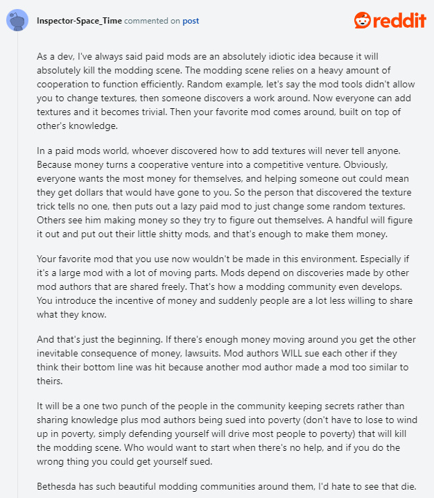 以現狀來說,由於社群內的知識與素材都會共享,因此可以視為社群全體協力合作一起製作 Mod。但玩家們擔心,如果 Mod 成為待售商品,將會使得社群之間的合作關係因此崩潰,或是為了爭奪內容與創意的權利而產生不必要的爭執與麻煩。也因為如此,使得 Bethesda 決定終止 Steam 工作坊的 Mod 付費販售計畫,而改採 Creation Club 的形式進行。