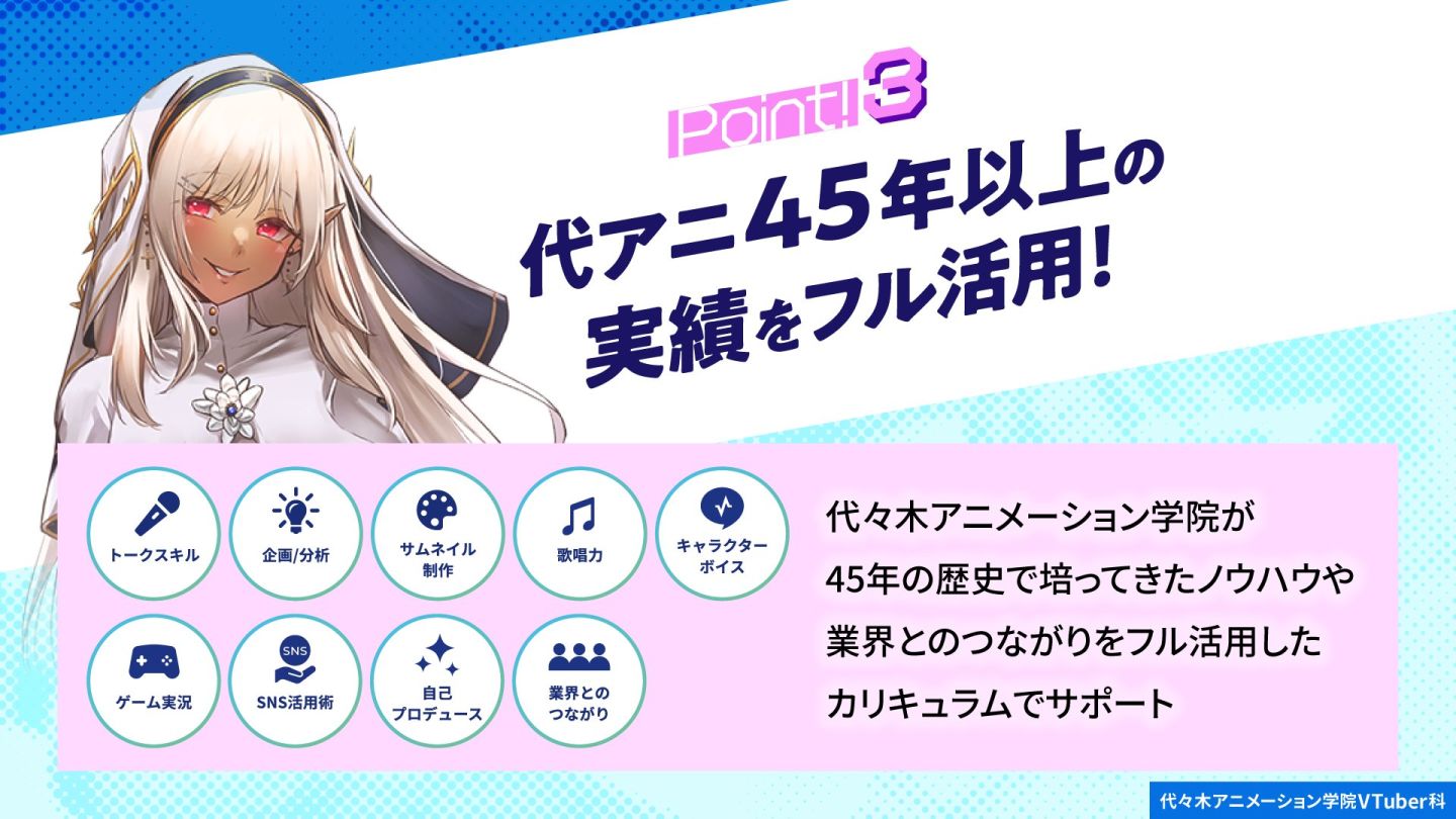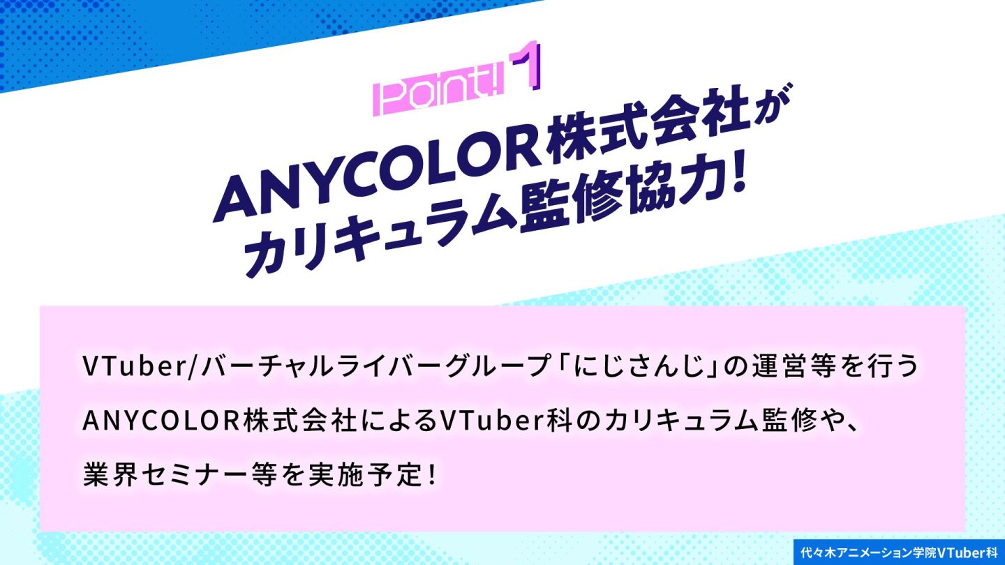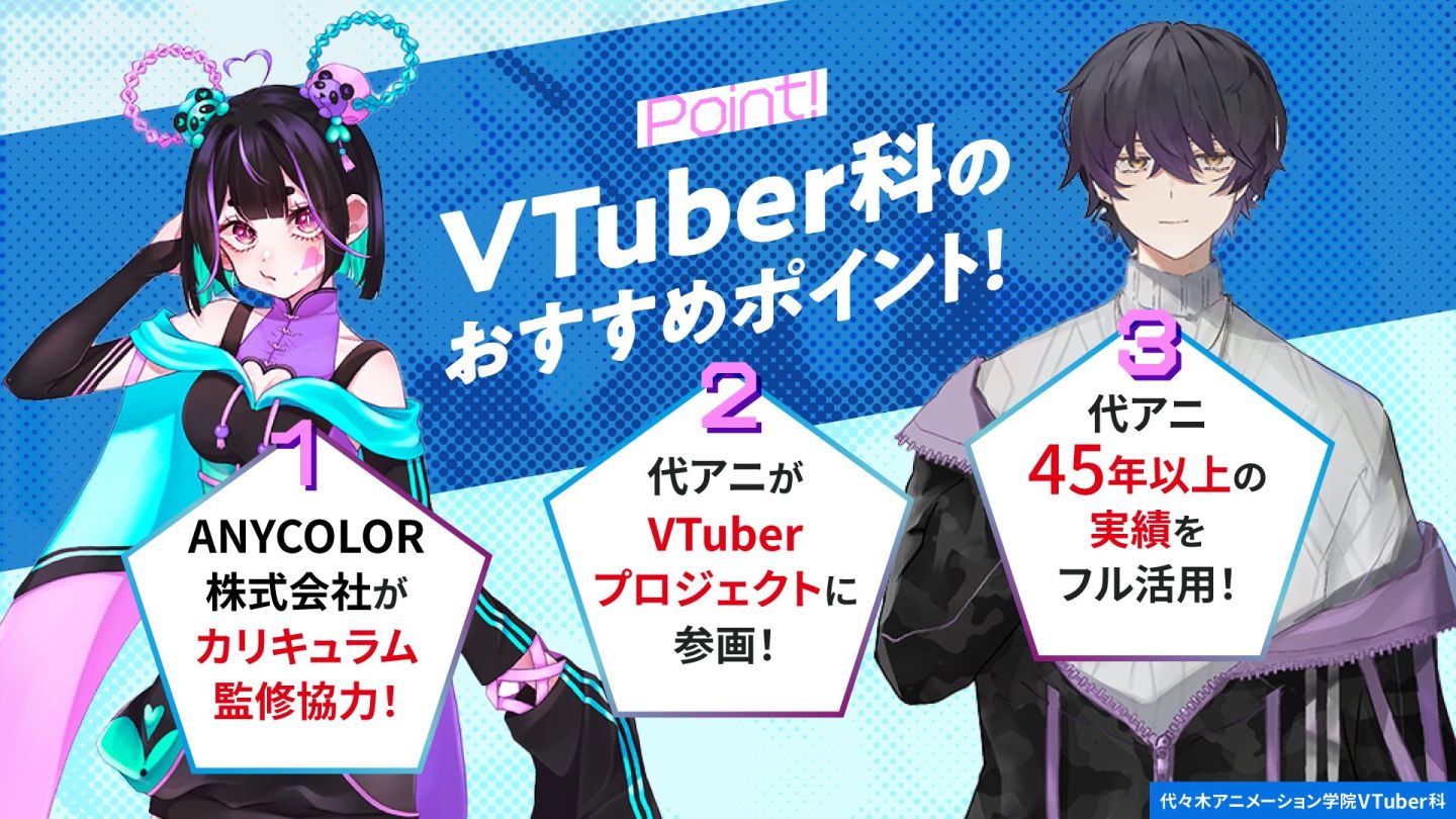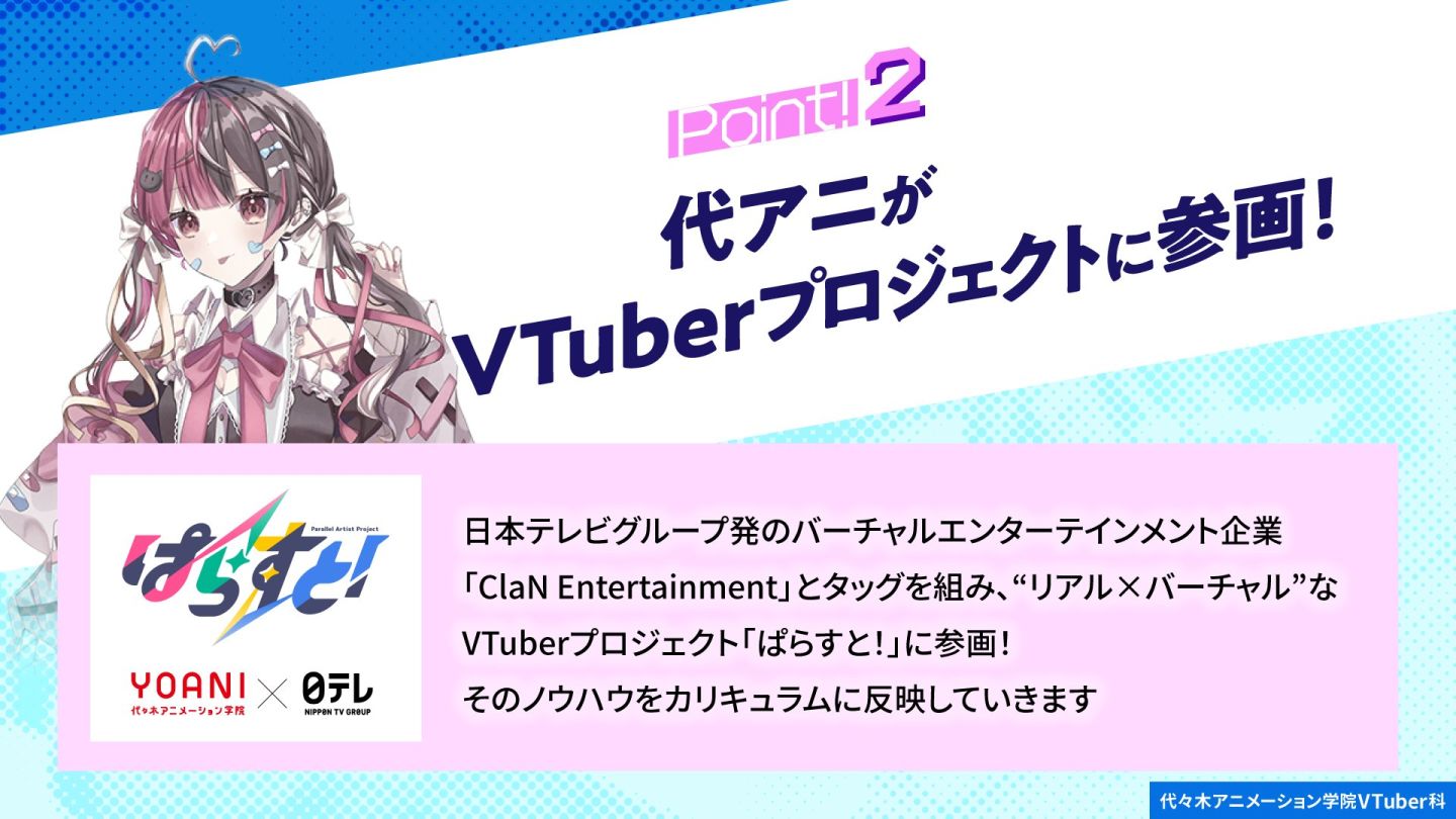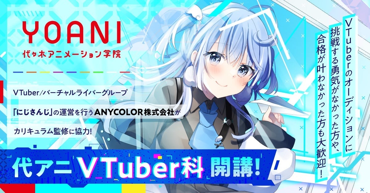 代代木動畫學院於 1978 年設立,是日本一所教學動畫和娛樂的專門教育機構,培育出多數活躍於娛樂業界的聲優、動畫師、漫畫家;有鑑於近年 Vtuber 行業的竄紅已發展成一個龐大的娛樂產業,在日本和海外都擁有熱情的粉絲,對於想在這行業一試身手的人來說,學校將為他們提供一個從基礎學習的環境和機會,讓他們獲得邁出第一步的信心。
