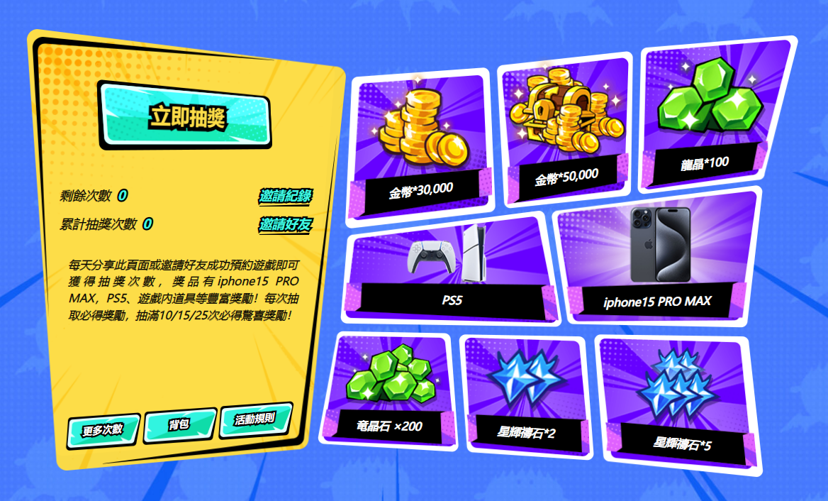 即日起只要於商店平台或事前登錄頁完成預約,參加官方事前登錄頁分享活動,就有機會贏取「iPhone15 Pro Max」、「PS5」等實物大獎,也可以在遊戲正式上市時獲得豐厚的階段獎勵。