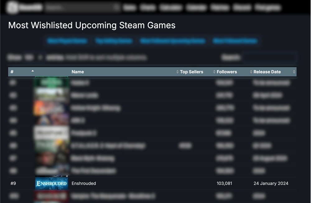 這款生存動作角色扮演遊戲充滿探索、建造和戰鬥要素,於 10 月榮登 Steam 新品節榜首。《霧鎖王國》在全球即將推出的 Steam 遊戲中,成功進入了最高願望清單的前十名,位居第九。
