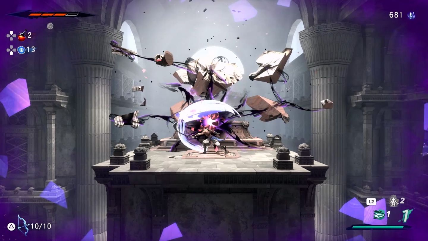 薩爾貢除了使用雙刀以外,隨著進度會取得遠程的長弓,序章能夠攜帶的數量有限,不過迷宮中有許多地方可以補充弓箭,施展遠程攻擊觸發機關,戰鬥累積的量表則是使用消耗「阿特拉」的必殺技,有強力突刺、釋放衝擊波,回覆生命值等多樣化的效果,冒險時最多攜帶兩種,攻擊時可以累積但受到傷害則消散。