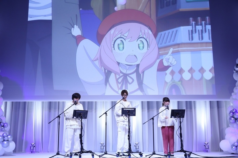 被問到對主演聲優群有何印象的中村與賀來,兩人各自發表了感想。中村說:「與安妮亞有對手戲時,心裡都會想『哇,我跟安妮亞講到話了!』而常常變得很興奮,今天實際見到面之後我也這麼覺得...」他一邊看向江口、種崎、松田一邊說:「洛伊德、安妮亞,雖然很抱歉但不包括彭德(會場大笑),正是因為有這些人讓我愛上作品,而今天還被他們這樣誇獎,我真的覺得很開心。」賀來說:「剛才我們還在後台聊到聲優與演員有什麼不一樣,真的很感謝聲優們跟我分享這些事情。」