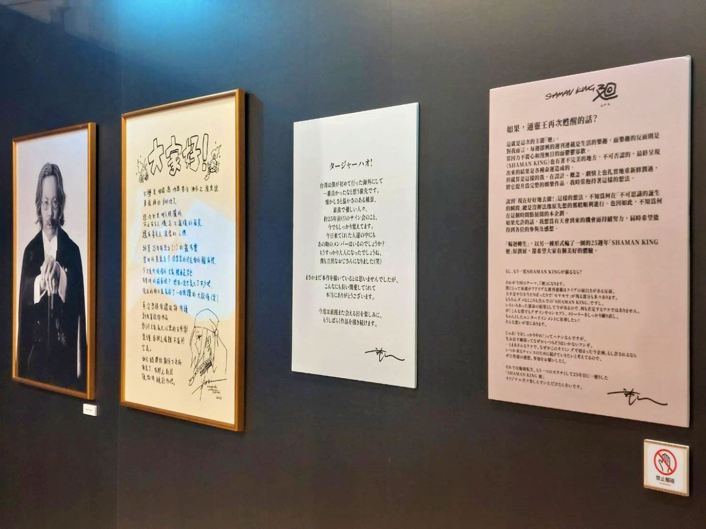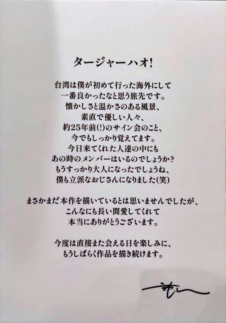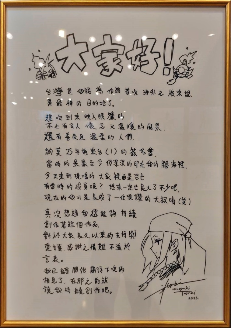 特展分為五個部分,入口處以武井宏之老師繪製的全新展覽主視覺裝飾,更加碼將其中的角色印製為立牌,擺放在展場入口處,光是看到這些角色立牌就已經有非常感謝的心情,武井老師甚至獻給台灣粉絲一封繁體中文手寫信,再搭配舉辦原畫展的原因和動機,裝飾在入口走道。在看完他的文字之後可以了解老師喜愛台灣的心情已經溢於言表,希望很快就能再度盼到武井老師來台!本次展覽也是武井老師相當重視的海外首展,若是粉絲們觀展後將心得分享到X(推特),相信老師一定會非常開心!
